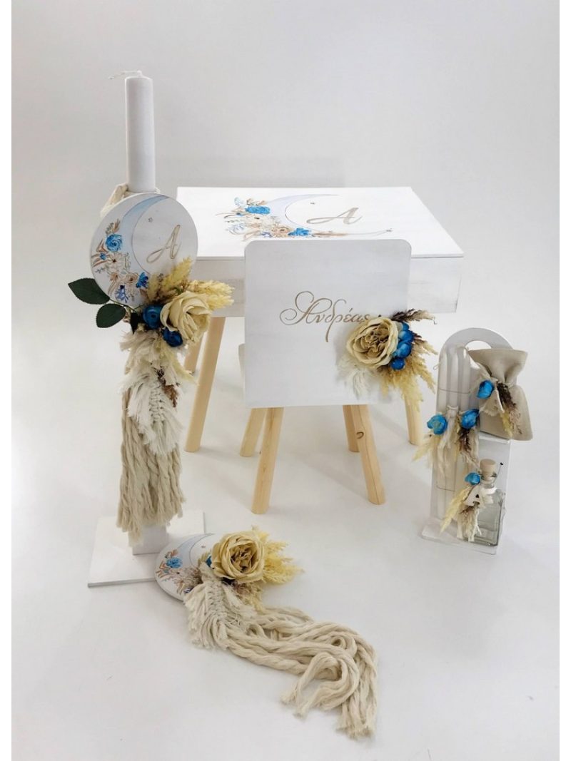 Το Βαπτιστικό σετ περιλαμβάνει (Λαμπάδα, Κουτί ή Βαλίτσα, τρία κεράκια, λαδοσετ με μπουκαλάκι για το λάδι και σαπουνάκι)