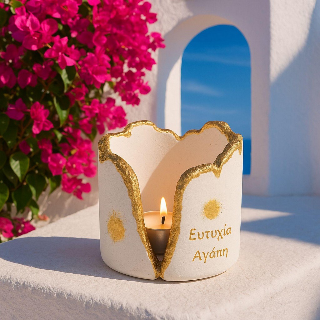 Ένα κομψό λευκό βαζάκι εξωτερικά διακοσμημένο με ευχές που ψιθυρίζουν αιώνια αγάπη και χρυσές πινελιές, ιδανικό δώρο για να ολοκληρώσετε την λαμπερή ημέρας σας.