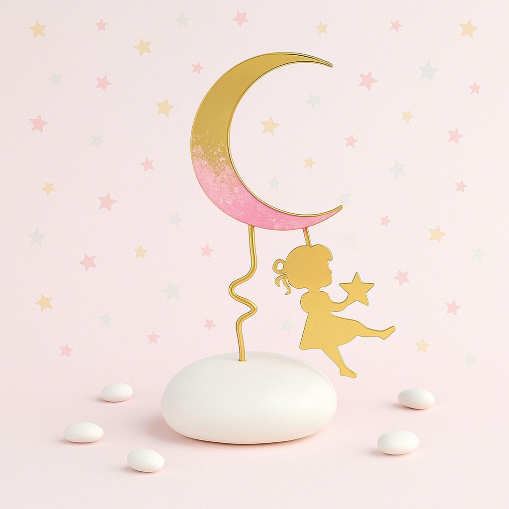 Μεταλλική μπομπονιέρα βάπτισης κορίτσι που αιωρείται ανέμελα σε κούνια, κάτω από την αγκαλιά του φεγγαριού δίνοντας μια πινελιά των παιδικών ονείρων στα χέρια των καλεσμένων σας.