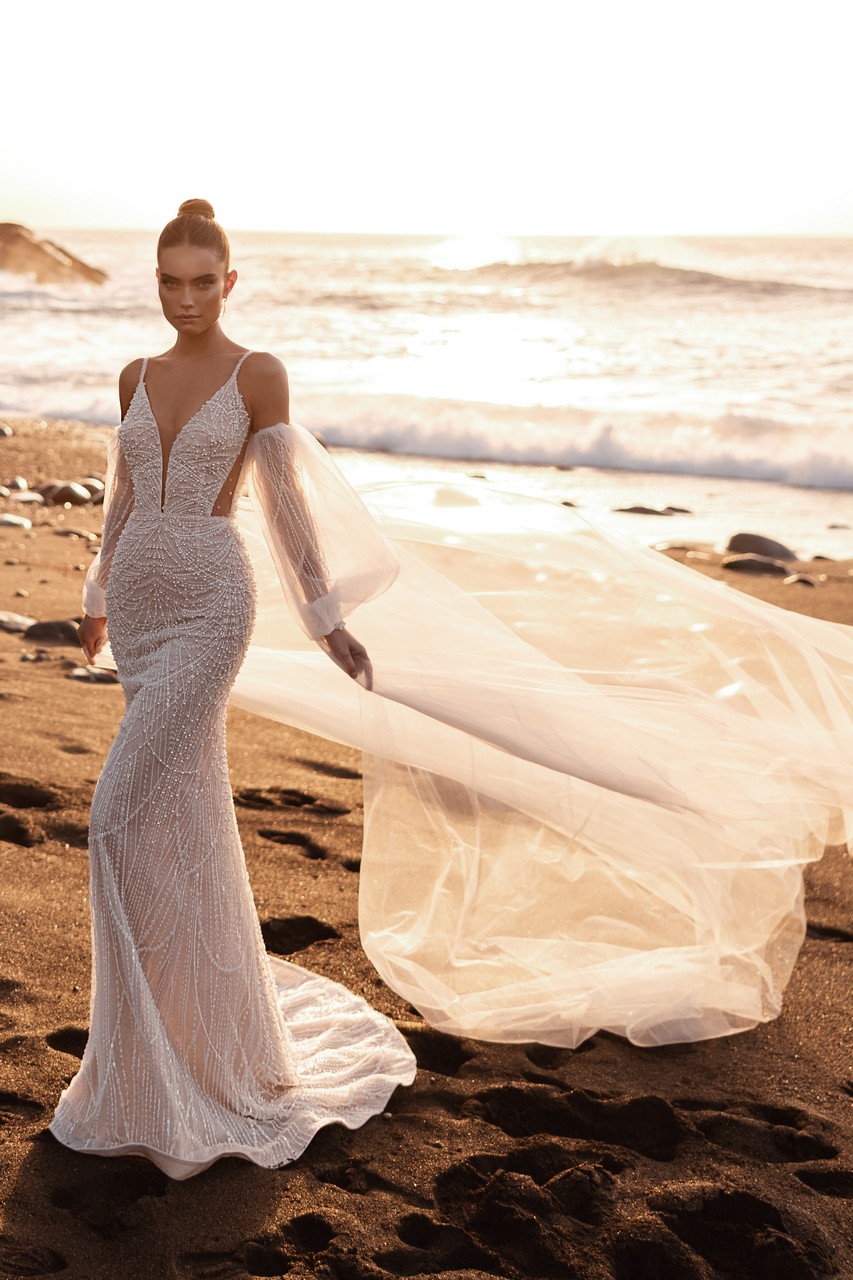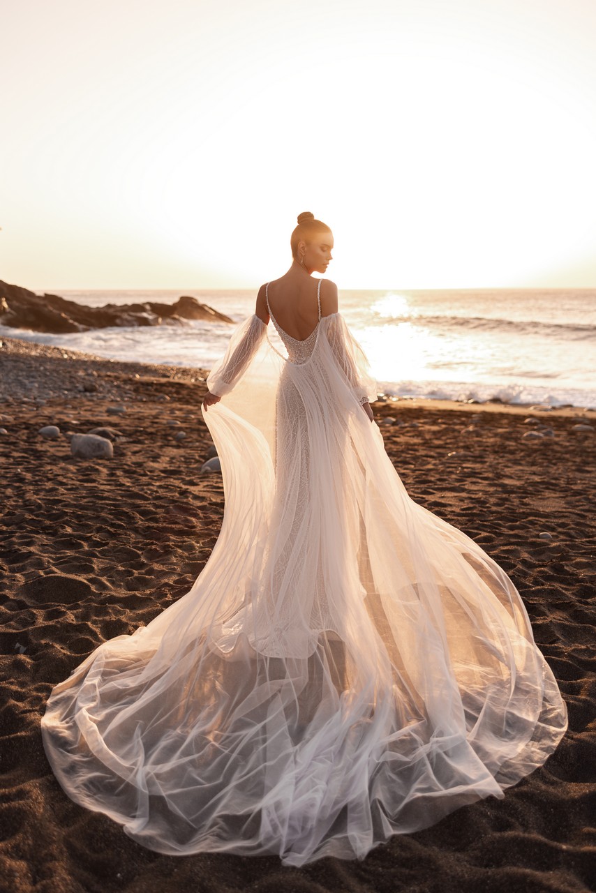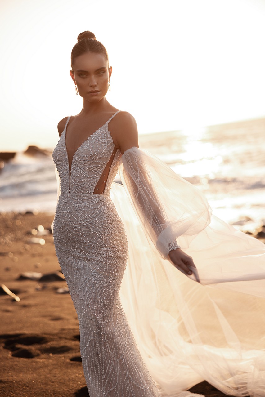 Η Rebecca είναι φτιαγμένη για τη νύφη που ονειρεύεται αξέχαστες εισόδους. Η εφαρμοστή σιλουέτα, κεντημένη εξ ολοκλήρου στο χέρι με χάντρες και μαργαριτάρια, αναδεικνύει κάθε καμπύλη με ακρίβεια και ανάλαφρη υφή. Η βαθιά λαιμόκοψη V και τα διαφανή πλαϊνά πάνελ προσδίδουν την κατάλληλη ποσότητα τόλμης, ενώ οι λεπτές τιράντες εξισορροπούν την εμφάνιση με διακριτική θηλυκότητα. Αυτό που κάνει την Rebecca πραγματικά μοναδική είναι η αποσπώμενη κάπα από τούλι. Αέρινη και ανάλαφρη, κινείται με τον άνεμο και δημιουργεί μια αίσθηση αβίαστης δραματικότητας, χαρίζοντας στη νύφη δύο εμφανίσεις σε μία – κομψή και σμιλεμένη χωρίς την κάπα, ή δυναμική και αιθέρια με αυτήν. Αυτό το φόρεμα έχει σχεδιαστεί για να γιορτάζει την αυτοπεποίθηση, την ομορφιά και την ατομικότητα στην πιο αγνή της μορφή.