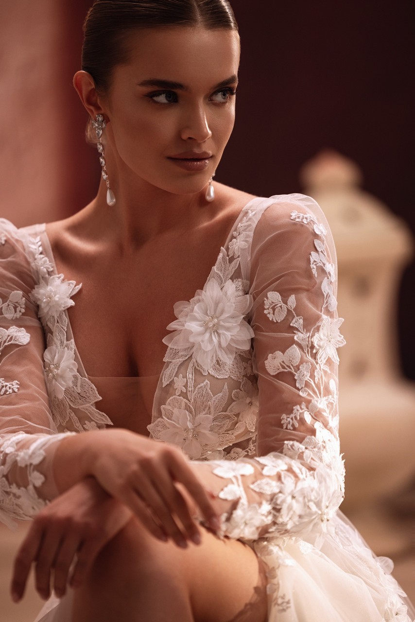 Το Semiramida είναι ένα φόρεμα που συνδυάζει την ελαφρότητα με εντυπωσιακές λεπτομέρειες. Το εφαρμοστό μπούστο είναι καλυμμένο με φλοράλ δαντέλα που συνεχίζεται στα διαφανή μανίκια, χαρίζοντας μια απαλή και θηλυκή πινελιά. Ένα βαθύ ντεκολτέ τραβάει την προσοχή στη μέση, ενώ η άνετη φούστα από τούλι προσθέτει κίνηση και ισορροπία. Το μπροστινό σκίσιμο δημιουργεί μια σίγουρη, μοντέρνα πινελιά, ιδανική για νύφες που θέλουν να νιώθουν ελεύθερες και αξέχαστες. Αυτό το φόρεμα είναι για τη νύφη που εκτιμά την λεπτή ομορφιά, αλλά θέλει επίσης ένα φόρεμα που κάνει τη διαφορά. Κάθε λεπτομέρεια του Semiramida έχει σχεδιαστεί για να σας κάνει να νιώθετε φυσικές, άνετες και εντελώς ο εαυτός σας την ημέρα του γάμου σας.