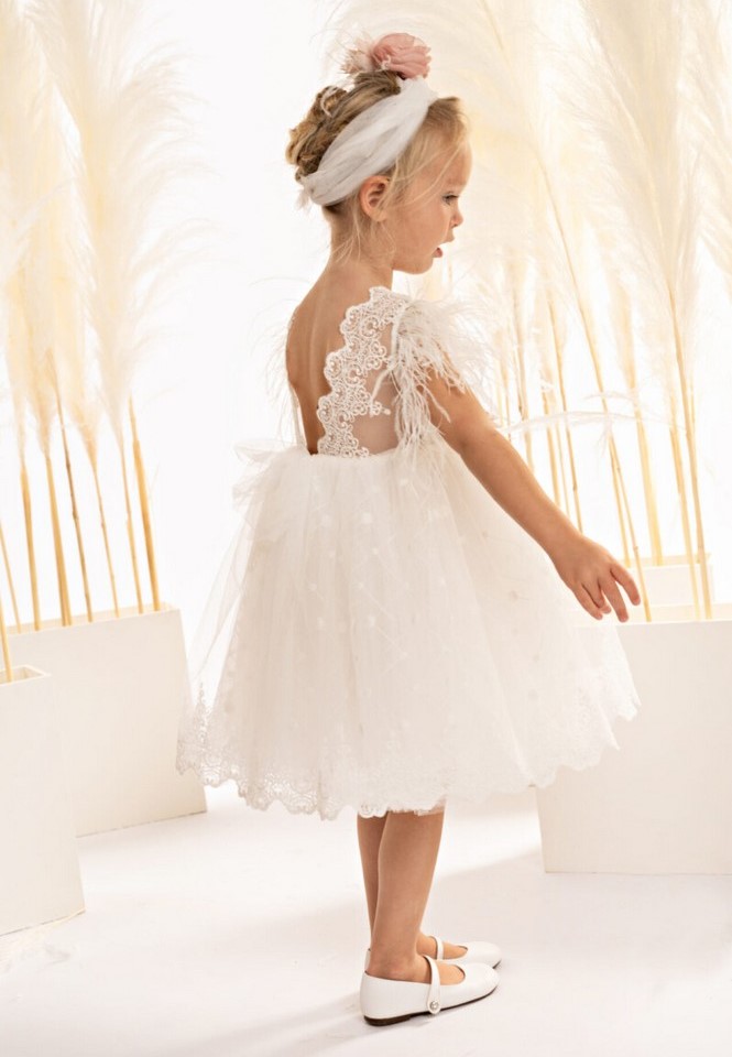 Σε off white χρώμα, αυτό το φόρεμα φτιαγμένο εξολοκλήρου από φίνα δαντέλα ξεχωρίζει για την εκλεπτυσμένη αισθητική του,. Το μπούστο, σε γραμμή καρδιάς από βαμβακερό ύφασμα δένει αρμονικά με την δαντέλα που αγκαλιάζει τους ώμους και συνεχίζει στο πίσω μέρος, δημιουργώντας μια εντυπωσιακή διάφανη ανοιχτή πλάτη που μαγνητίζει τα βλέμματα. Στην θέση των μανικιών, αέρινα φτερά προσθέτουν μια ανάλαφρη, παραμυθένια αίσθηση. Η φούστα, με πλούσιες σούρες από δαντέλα, χαρίζει όγκο και κίνηση, ενισχύοντας τη ρομαντική φύση του σχεδίου. Η εμφάνιση ολοκληρώνεται με ντελικάτα χειροποίητα λουλούδια σε απαλές ροζ και μπεζ αποχρώσεις, που στολίζουν το μπούστο, ενώ μια κομψή κορδέλα για τα μαλλιά, διακοσμημένη με τα ίδια λουλουδάτα μοτίβα, προσθέτει την τελευταία πινελιά σε αυτήν την ονειρική δημιουργία. Όλα τα φορέματα διαθέτουν βαμβακερή φόδρα και φουρό