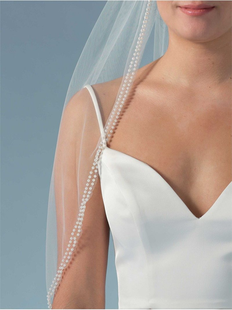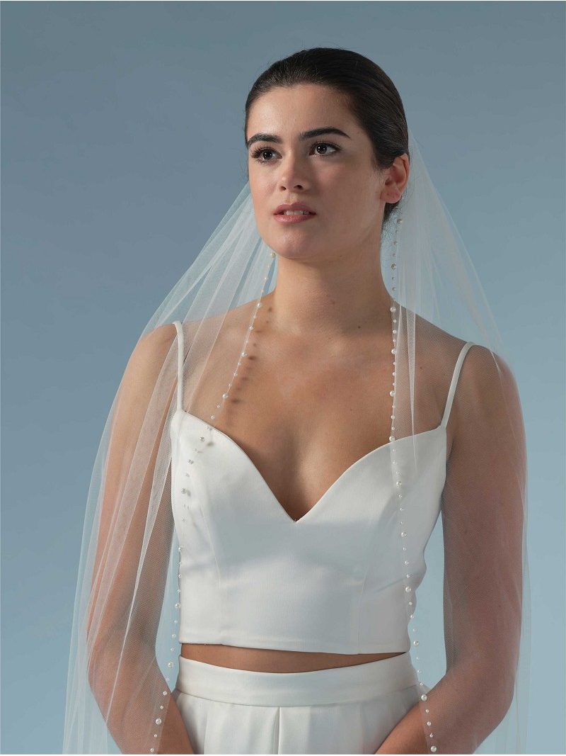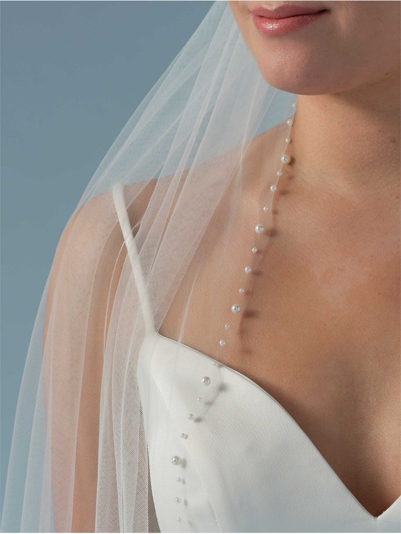 Πέπλο από απαλό τούλι σε χρώμα ιβουάρ, διακοσμημένο με διπλή σειρά μαργαριταριών στην άκρη του | Μήκος: 75 cm S460-075–1–SOFT