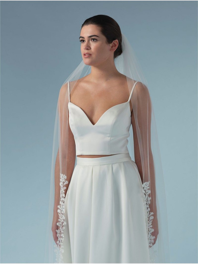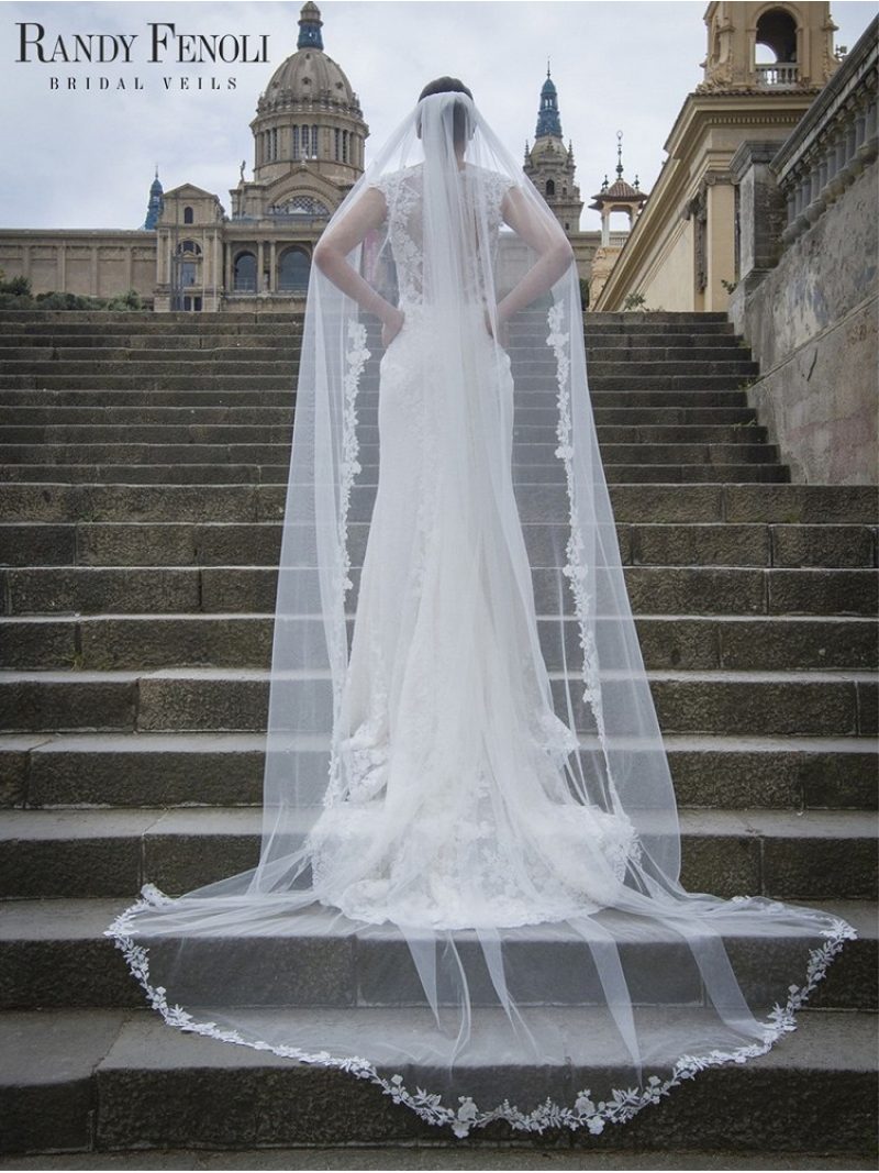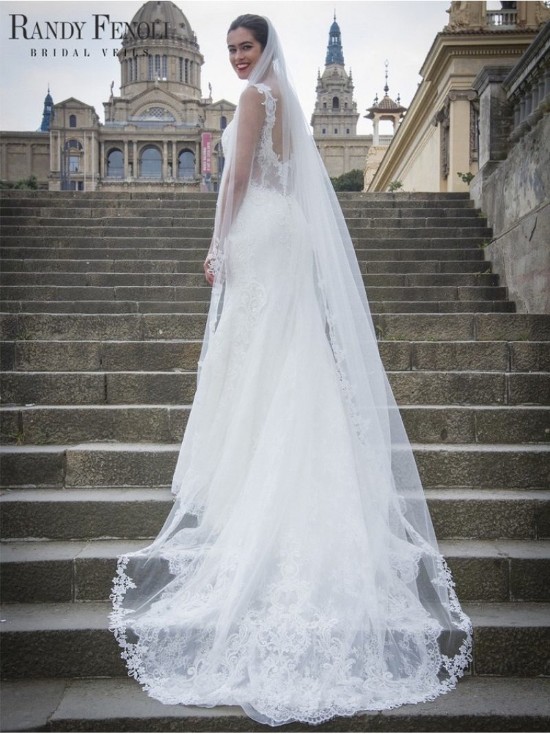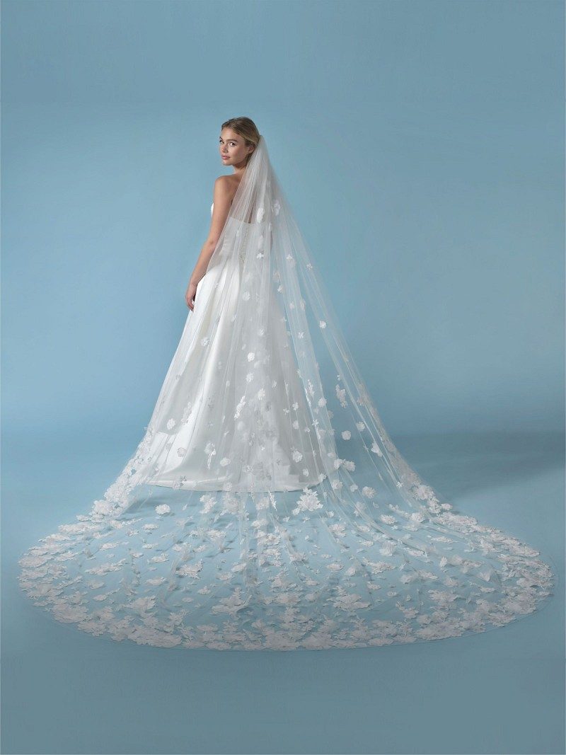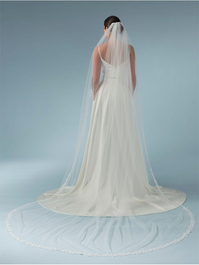 Νυφικό πέπλο μονής στρώσης από απαλό τούλι με κεντημένο σχέδιο λουλουδιών δαντέλας, πέρλες και πούλιες 300cm S701-300–1–SOFT