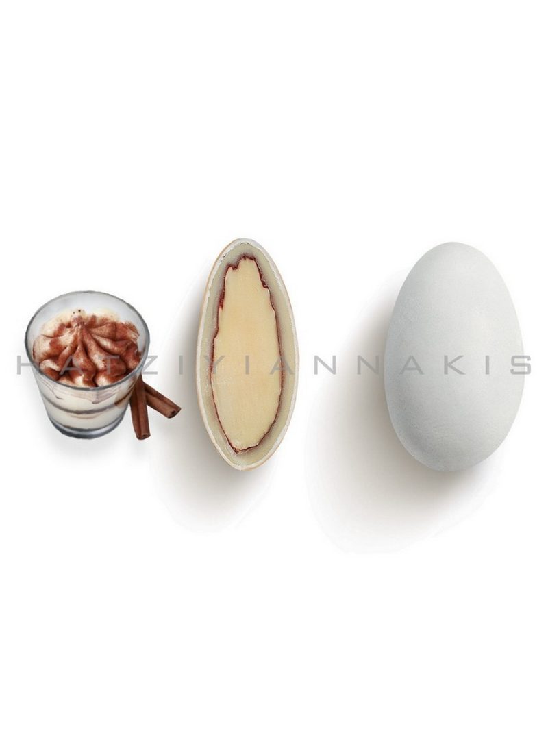 Κουφέτα Χατζηγιαννάκη Cocoa Milky Almond Twist καραμέλα με ολόκληρο καβουρδισμένο αμύγδαλο και κρέμα κακάο με λεπτή επικάλυψη ζάχαρης, σε λευκό χρώμα.