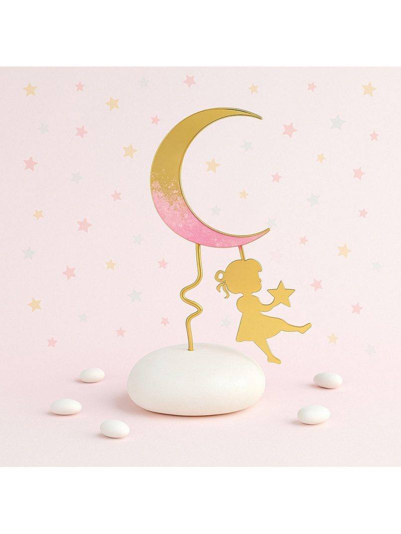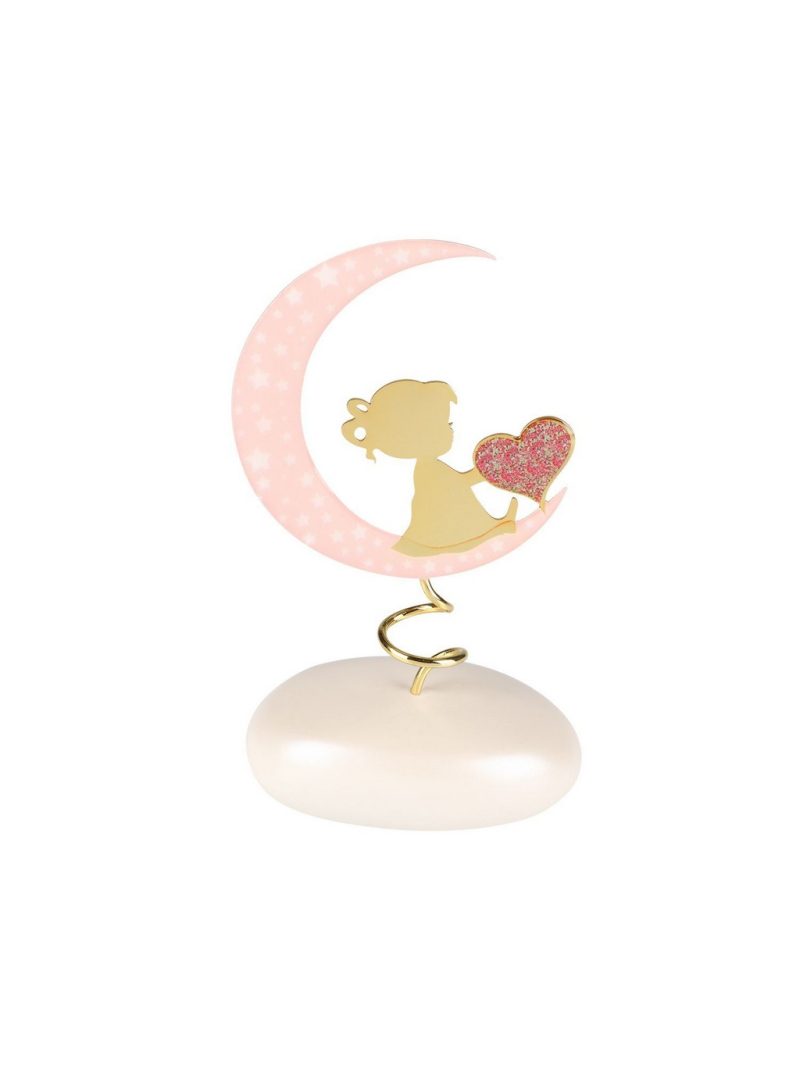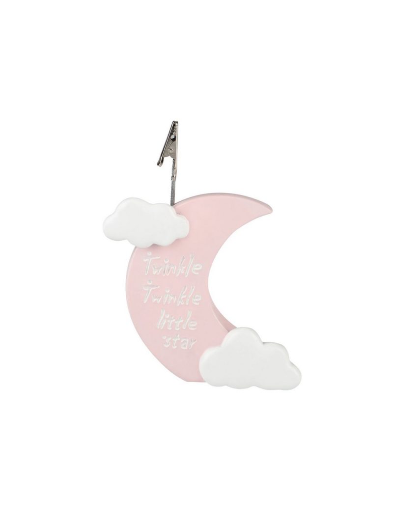 Μπομπονιέρα βάπτισης εμπνευσμένη από το φεγγάρι ζωγραφισμένη σε αποχρώσεις ροζ και κίτρινου με ένα διακριτικό κλιπ που θα μετατρέψει την κάθε στιγμή σε μια λαμπερή ανάμνηση. Ύψος: 14cm x Πλάτος: 6cm