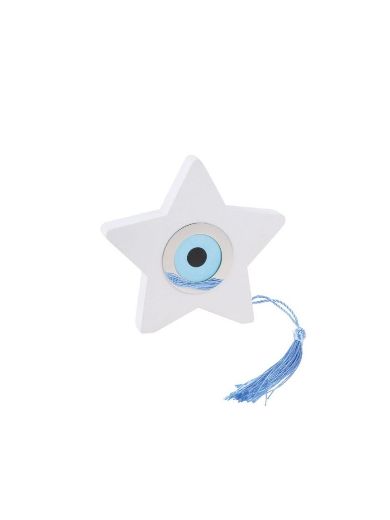 Μια κομψή μπομπονιέρα βάπτισης που παρουσιάζει ένα εντυπωσιακό αστέρι διακοσμημένο με ματάκι, προσφέροντας ένα άγγιγμα μαγείας και καλοτυχίας. Ύψος: 9cm x Πλάτος: 9cm