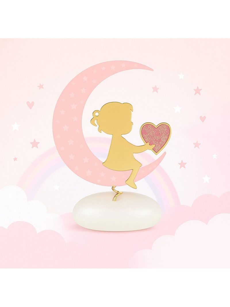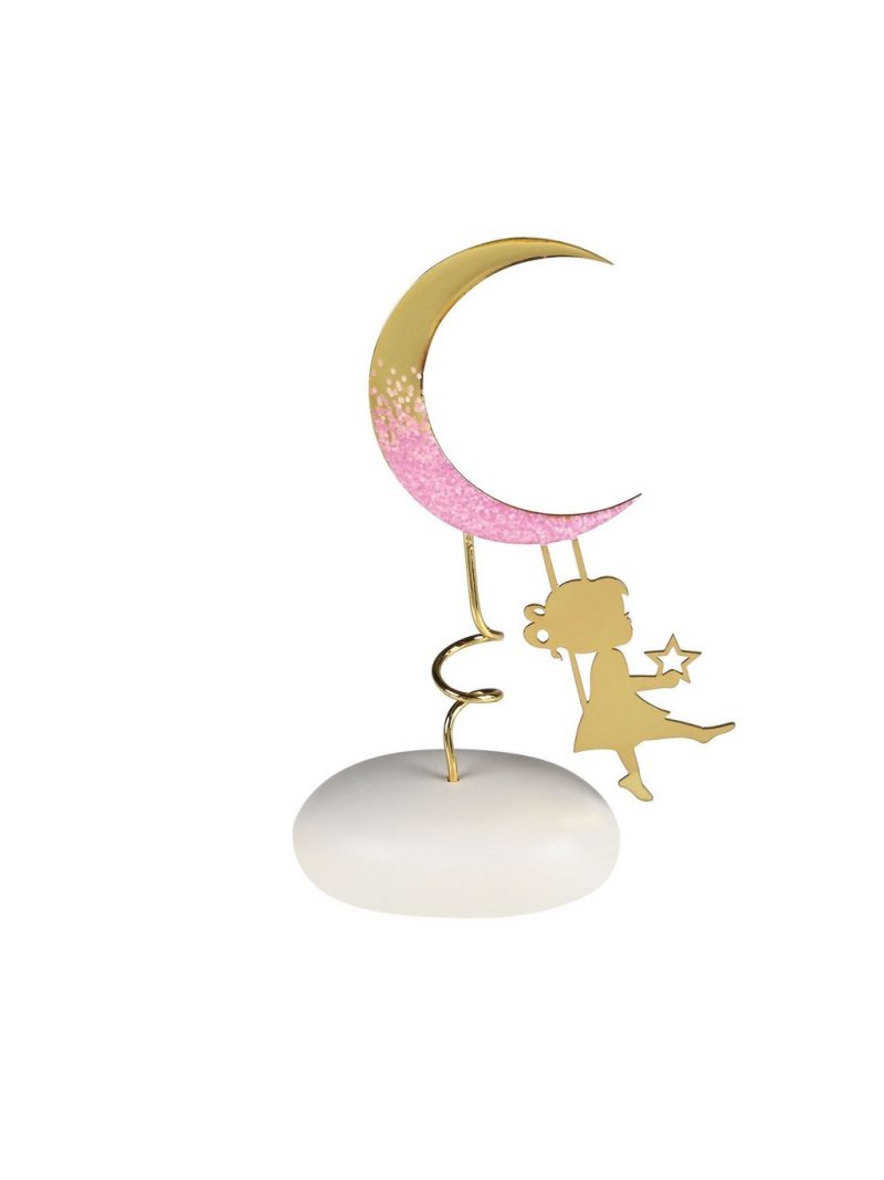 Μεταλλική μπομπονιέρα βάπτισης κορίτσι που αιωρείται ανέμελα σε κούνια, κάτω από την αγκαλιά του φεγγαριού δίνοντας μια πινελιά των παιδικών ονείρων στα χέρια των καλεσμένων σας.