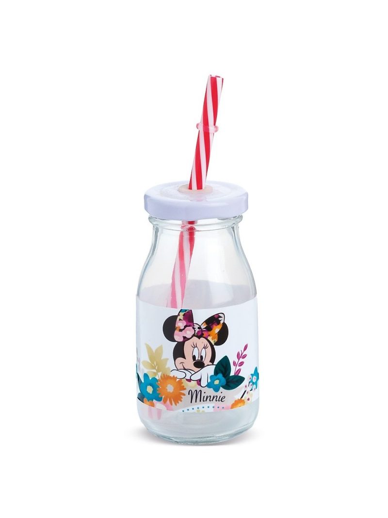 Disney γυάλινο μπουκάλι γάλακτος 200ml με λευκό μεταλλικό καπάκι. Συνοδεύεται από πολύχρωμα καλαμάκια. Είναι διακοσμημένο με αυτοκόλλητο print Minnie Flowers σε μπλε-μπορντώ αποχρώσεις. Χωρητ.: 200ml Ύψος 12,2cm Διάμετρος: 6cm