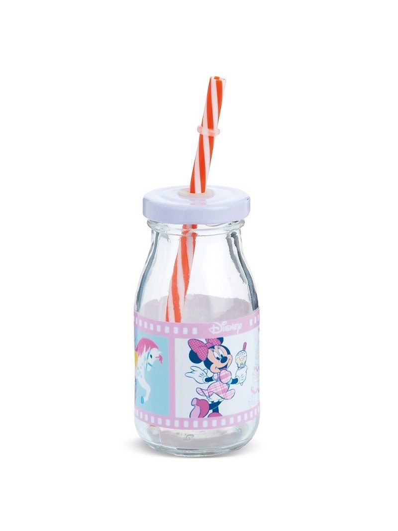 Disney γυάλινο μπουκάλι γάλακτος 200ml με λευκό μεταλλικό καπάκι. Συνοδεύεται από πολύχρωμα καλαμάκια. Είναι διακοσμημένο με αυτοκόλλητο print Minnie Carousel σε σιέλ-ροζ αποχρώσεις. Χωρητ.: 200ml Ύψος 12,2cm Διάμετρος: 6cm