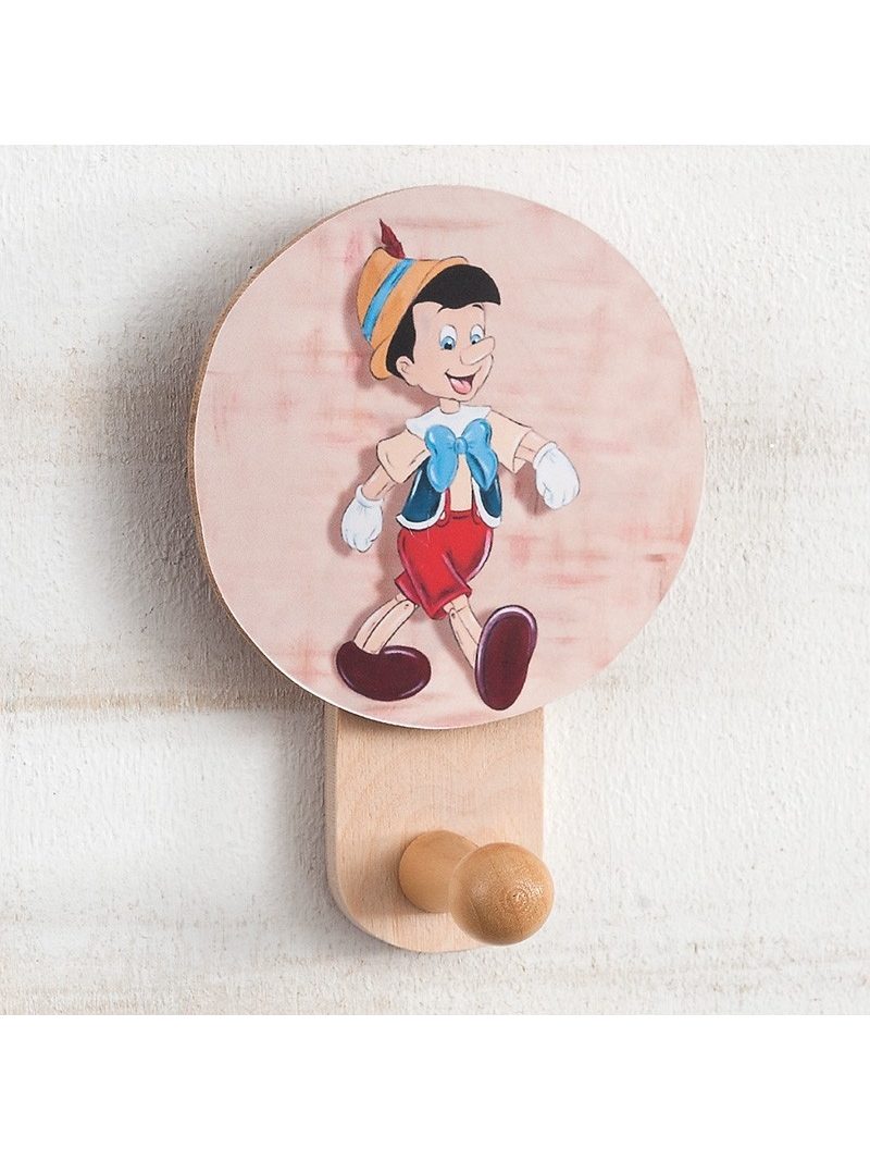 Ξύλινη natural κρεμάστρα τοίχου, διακοσμημένη με στρογγυλό κοπτικό πάνω στο οποίο είναι τυπωμένη παράσταση με τον Πινόκιο.