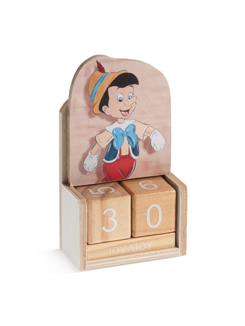 Ξύλινο ημερολόγιο με κύβους σε natural χρώμα. Διακοσμημένο με κοπτικό Πινόκιο.