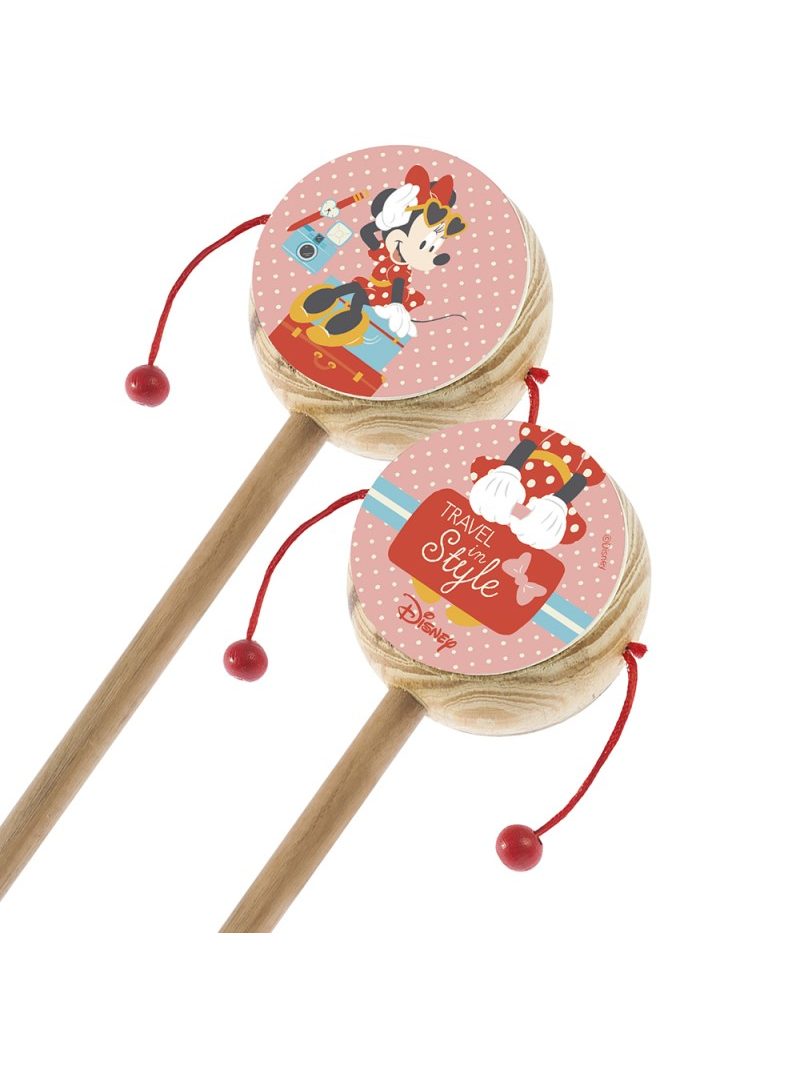 Disney ξύλινο natural τυμπανάκι. Είναι διακοσμημένο με αυτοκόλλητο print Minnie mouse " Travel in style" σε κόκκινες αποχρώσεις με διαφορετικό σχέδιο μπρος-πίσω.   Διάστ.: 6,5x20cm