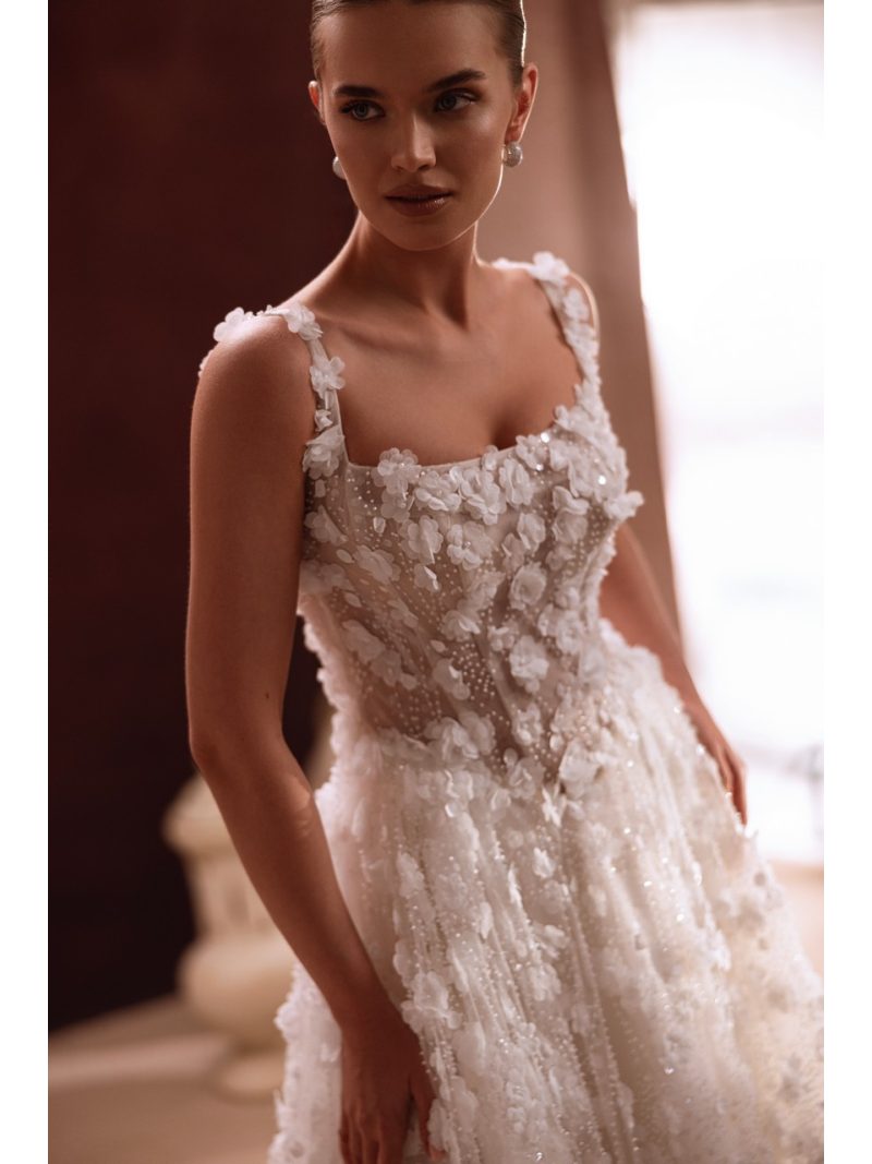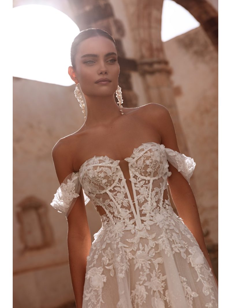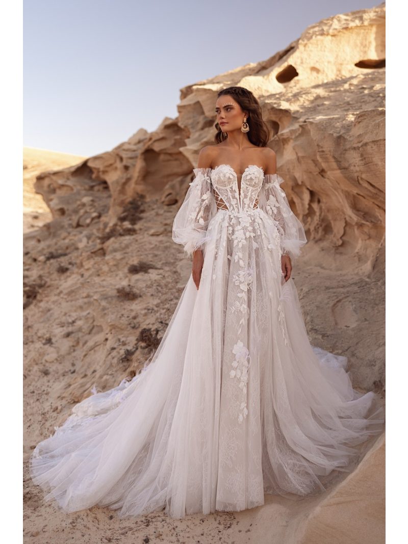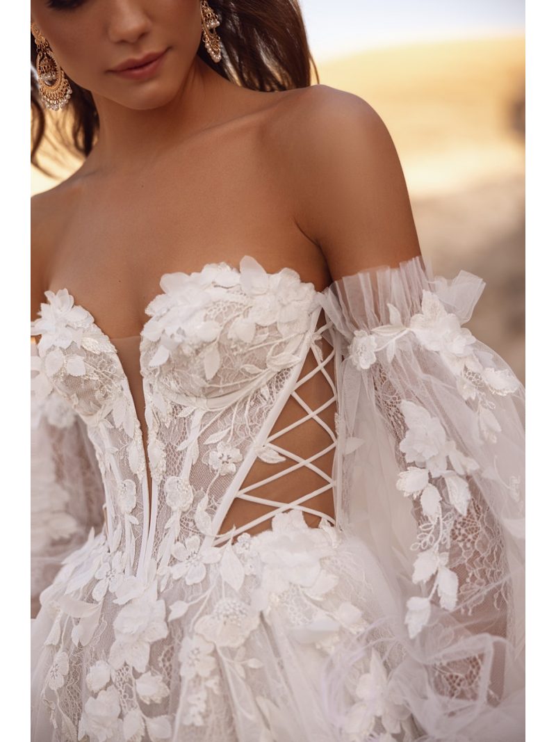 Το φόρεμα Lilibeth έχει σχεδιαστεί για νύφες που ονειρεύονται ρομαντισμό και θέλουν κάθε λεπτομέρεια του φορέματός τους να είναι ξεχωριστή. Το εφαρμοστό μπούστο είναι διακοσμημένο με τρισδιάστατα φλοράλ απλικέ που δημιουργούν μια λεπτή μετάβαση στην απαλή, ρέουσα φούστα. Τα διαφανή, αποσπώμενα μανίκια σε σχήμα φουσκωτού προσθέτουν μια πινελιά δράματος, δίνοντάς σας την ελευθερία να αλλάζετε την εμφάνισή σας όλη την ημέρα. Η βαθιά λαιμόκοψη και οι ανοιχτοί ώμοι ισορροπούν τη θηλυκότητα με την αυτοπεποίθηση, καθιστώντας αυτό το φόρεμα αξέχαστο από την τελετή μέχρι τη δεξίωση.
