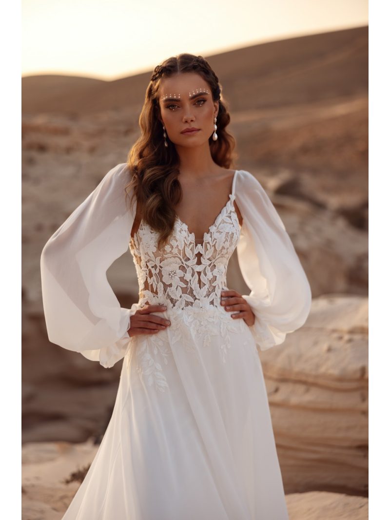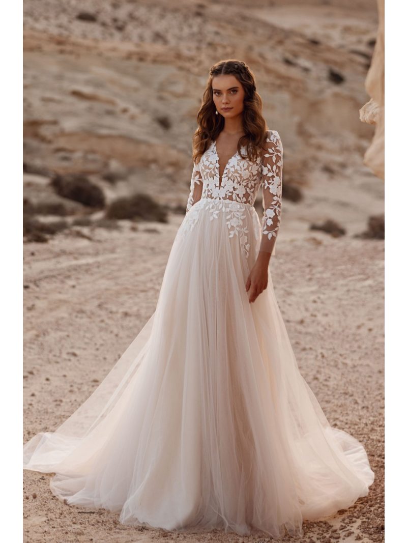 Το Armori είναι ένα φόρεμα σχεδιασμένο για νύφες που θέλουν μια εμφάνιση ρομαντική, εκλεπτυσμένη και αβίαστα θηλυκή. Η βαθιά λαιμόκοψη σε σχήμα V διαμορφώνει όμορφα τη σιλουέτα, ενώ το εφαρμοστό μπούστο με απλικέ από φλοράλ δαντέλα τραβάει την προσοχή με τις λεπτές λεπτομέρειες. Τα διάφανα μακριά μανίκια προσφέρουν μια αίσθηση ελαφριάς κάλυψης, ολοκληρώνονται με ασορτί δαντέλα που συνδυάζεται άψογα με το σχέδιο. Η ρέουσα φούστα από τούλι δημιουργεί απαλή κίνηση, δίνοντας στο φόρεμα έναν ανάλαφρο και χαριτωμένο χαρακτήρα που είναι εντυπωσιακός χωρίς να είναι υπερβολικός. Αυτό είναι ένα φόρεμα για γυναίκες που θέλουν να αισθάνονται σίγουρες, χαριτωμένες και πραγματικά αξέχαστες την ημέρα του γάμου τους - ένα σχέδιο που εξισορροπεί την απαλότητα με τη δύναμη σε κάθε λεπτομέρεια.
