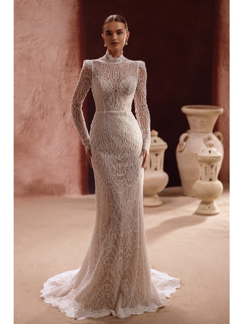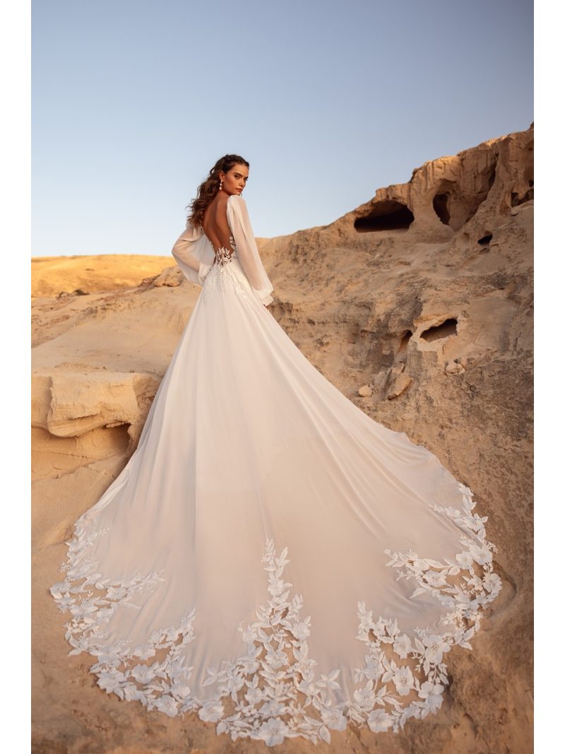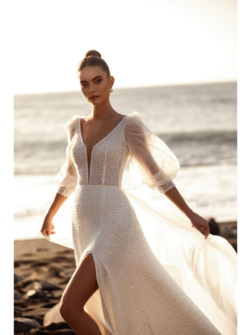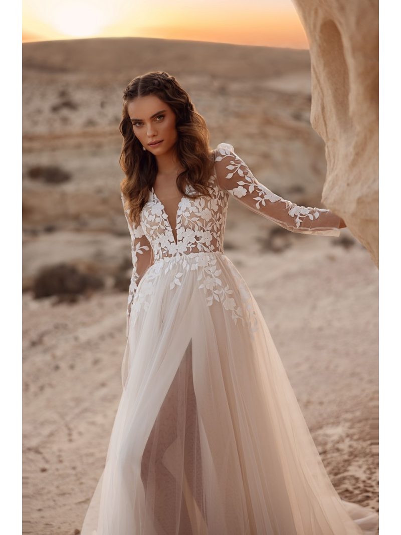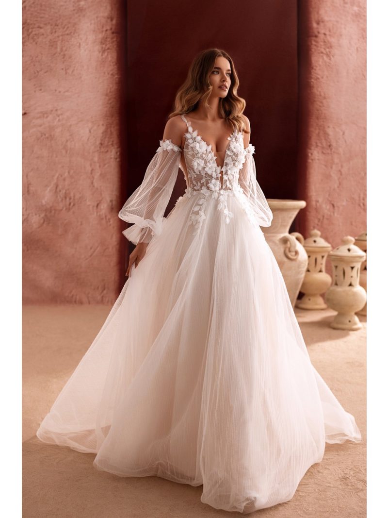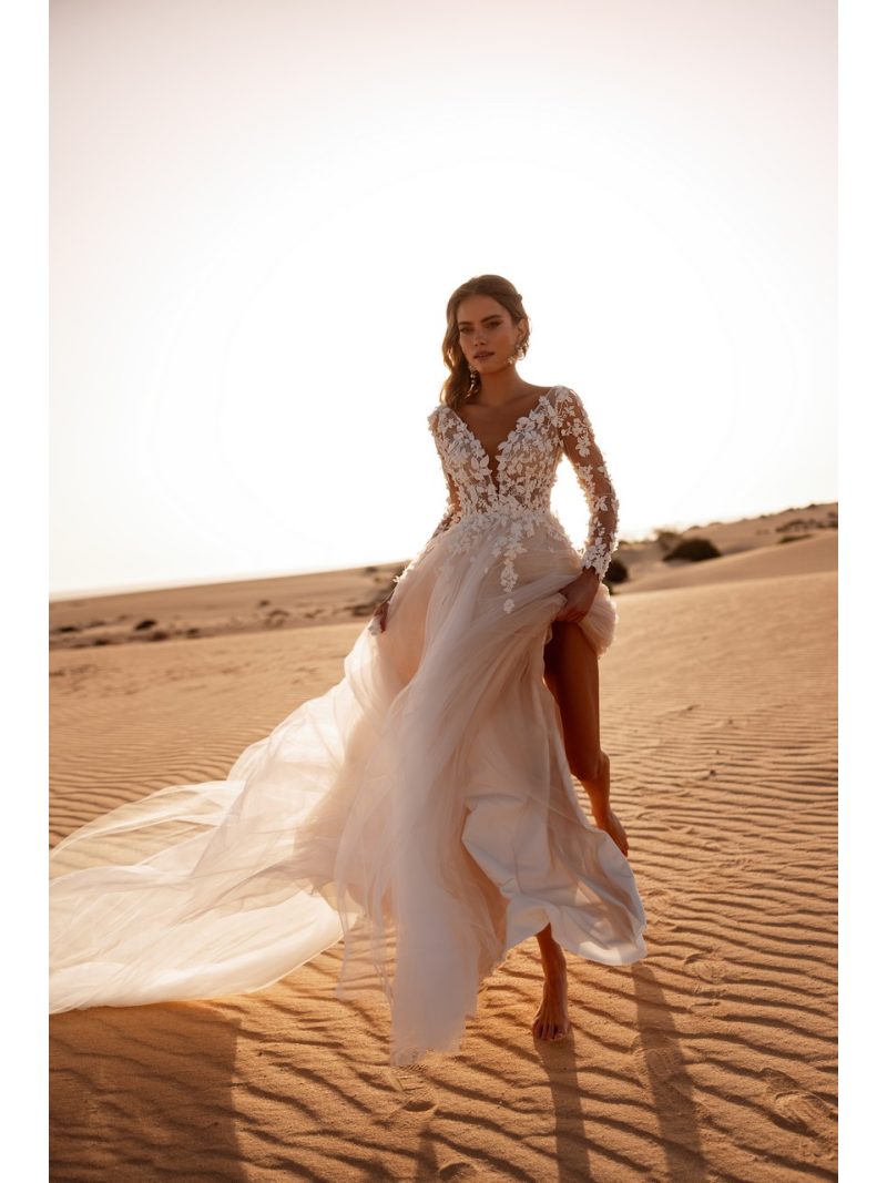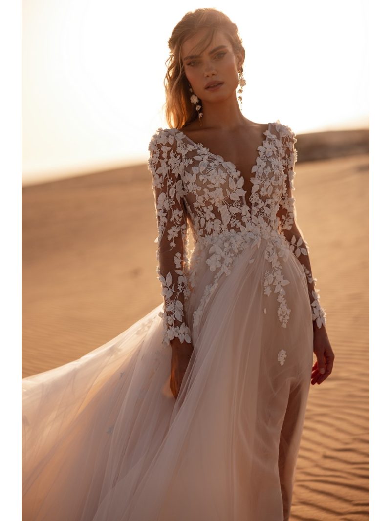 Το φόρεμα Farida είναι φτιαγμένο για νύφες που ονειρεύονται μια εμφάνιση εντυπωσιακή και ρομαντική. Το εφαρμοστό μπούστο καλύπτεται από περίτεχνα φλοράλ απλικέ που συνεχίζονται στα μακριά διάφανα μανίκια, δημιουργώντας μια απαλή αλλά και κομψή σιλουέτα. Το βαθύ ντεκολτέ προσθέτει μια πινελιά γοητείας, ενώ η ρέουσα φούστα από τούλι και η μακριά ουρά προσφέρουν αβίαστη κίνηση και ανάλαφρη αίσθηση. Είναι ένα φόρεμα που ισορροπεί τη λεπτομέρεια με την ελευθερία, ιδανικό για να περπατήσετε στον διάδρομο και να χορέψετε όλη τη νύχτα.