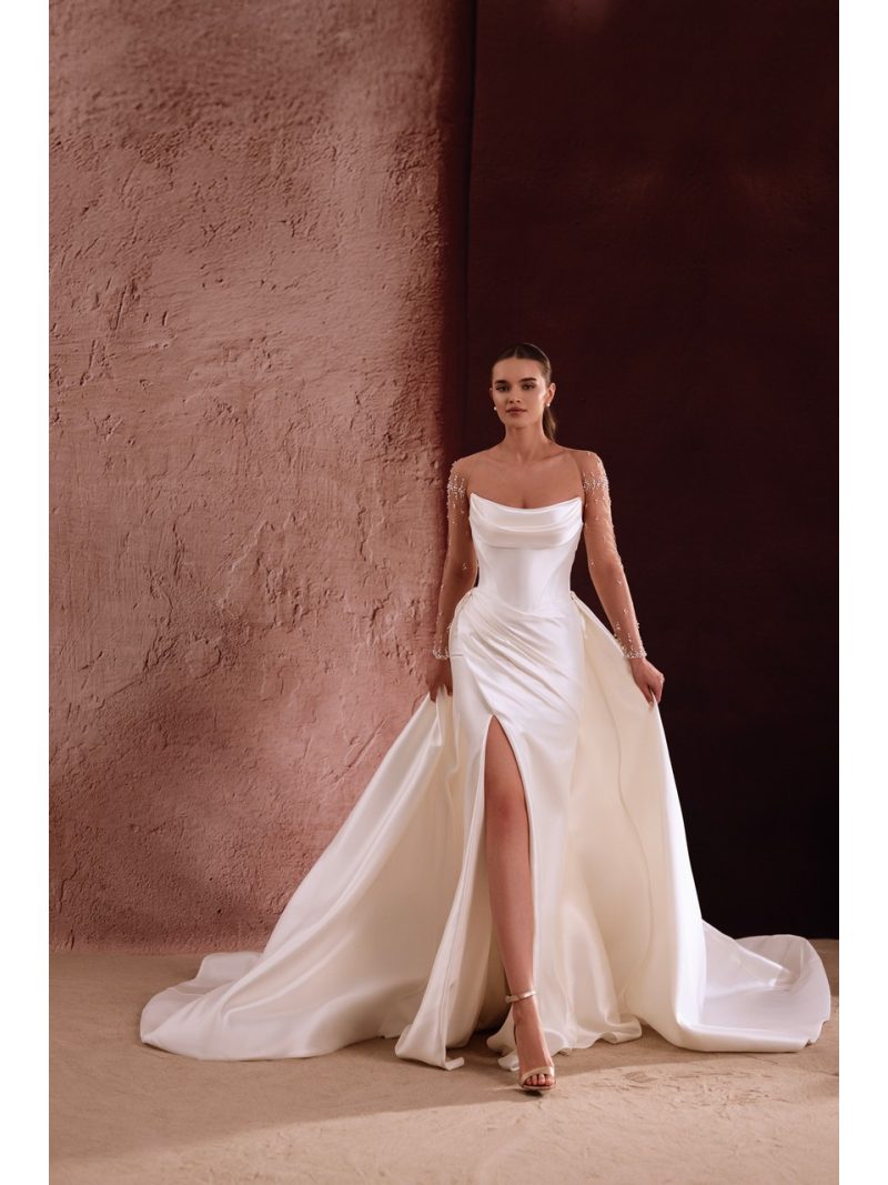 Το Aylin είναι ένα νυφικό που δημιουργήθηκε για νύφες που επιθυμούν κομψότητα με διακριτικές άκρες. Η απαλή σατέν βάση εφαρμόζει όμορφα γύρω από το σώμα, ενώ το απαλό ντραπέ ντεκολτέ προσθέτει διάσταση χωρίς να αφαιρεί την καθαρή σιλουέτα. Τα διάφανα μανίκια, διακοσμημένα με λεπτές πέρλες, δημιουργούν μια πινελιά λάμψης που δίνει μια αίσθηση εκλεπτυσμένης και όχι υπερβολικής. Το μπροστινό σκίσιμο προσθέτει κίνηση και μια νότα τόλμης, καθιστώντας το φόρεμα χαριτωμένο και αξέχαστο. Η αποσπώμενη overskirt δίνει στις νύφες την ελευθερία να επιλέξουν ανάμεσα σε μια κομψή εφαρμοστή εμφάνιση και μια εντυπωσιακή ουρά, προσφέροντας ευελιξία για την τελετή και τον εορτασμό που ακολουθεί.