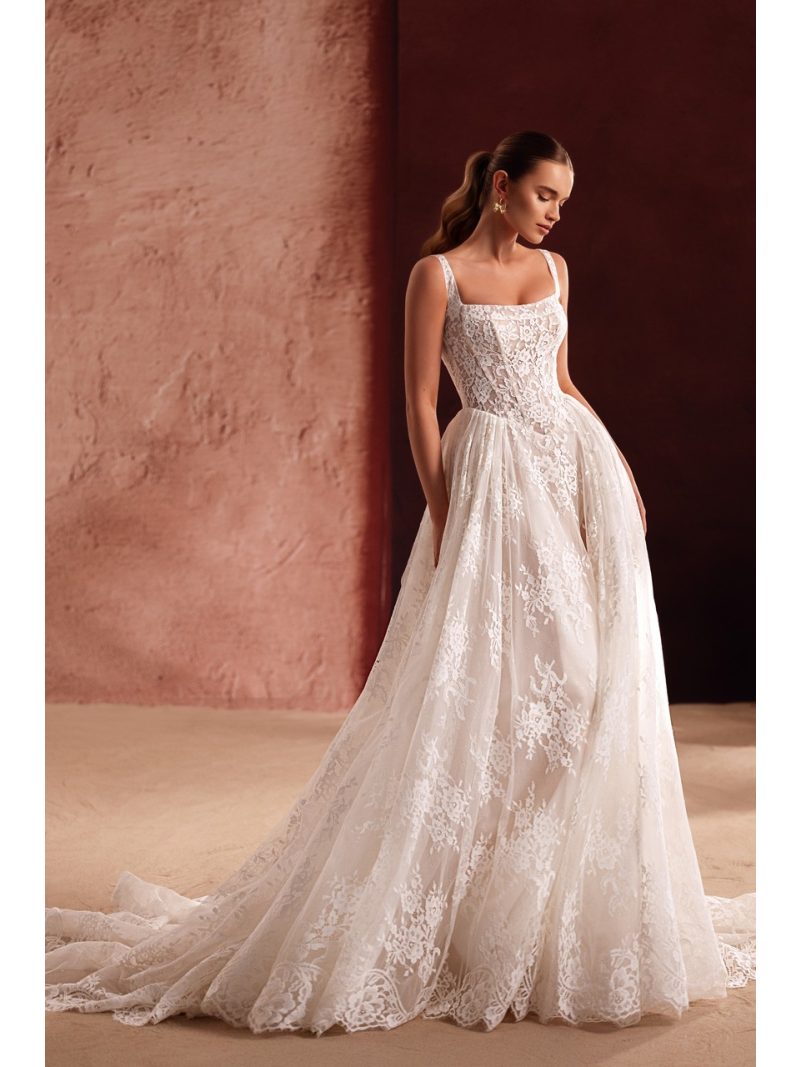 Το Becco είναι ένα φόρεμα που δημιουργήθηκε για νύφες που εκτιμούν τη λεπτομέρεια όσο και την παρουσία. Το δομημένο μπούστο με τις φαρδιές τιράντες πλαισιώνει όμορφα το ντεκολτέ, ενώ το σχέδιο δαντέλας σε όλη την επιφάνεια δίνει στο φόρεμα ένα πλούσιο, ανάγλυφο φινίρισμα. Ρέοντας μέσα σε μια φαρδιά φούστα και μια φαρδιά ουρά, το φόρεμα κινείται με χάρη και δημιουργεί μια εντυπωσιακή εντύπωση από κάθε γωνία. Αυτό το φόρεμα συνδυάζει τον ρομαντισμό με τη δύναμη - ιδανικό για νύφες που θέλουν η εμφάνισή τους να είναι διαχρονική αλλά και πραγματικά προσωπική.