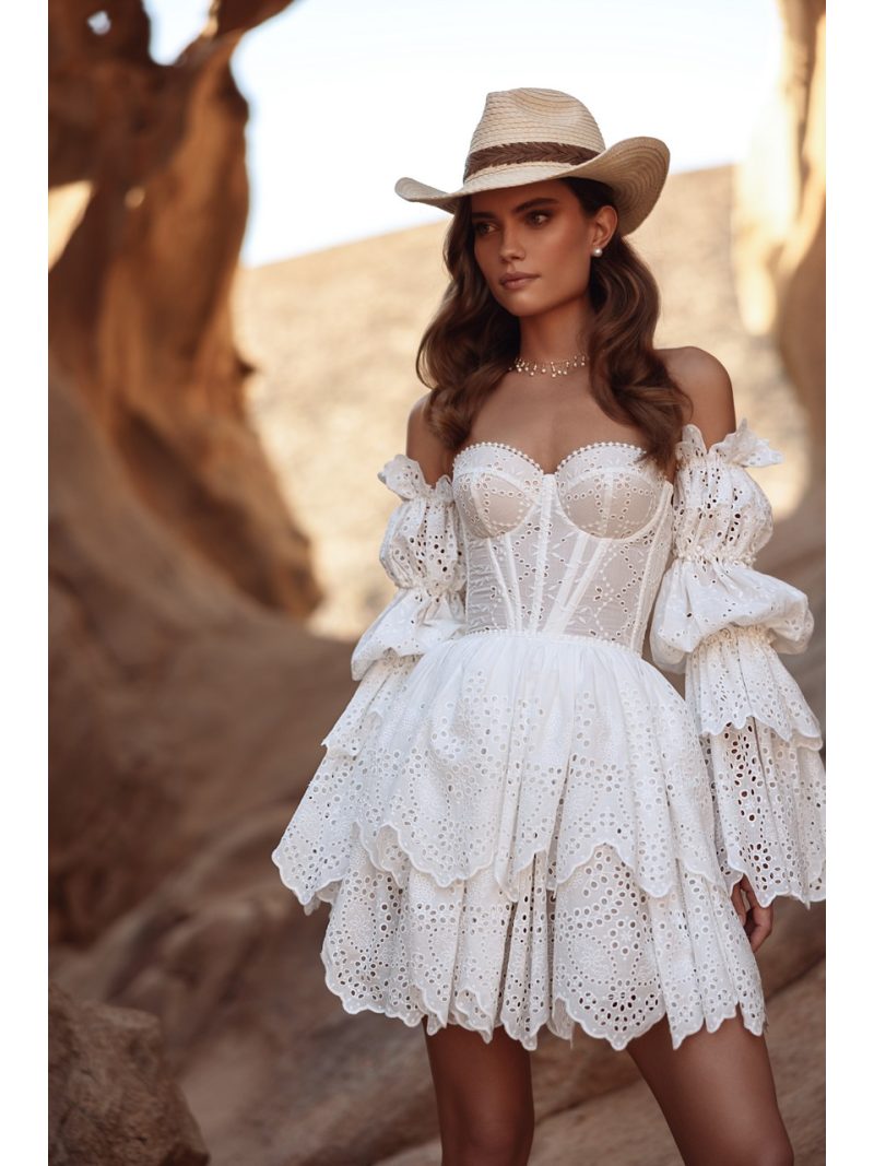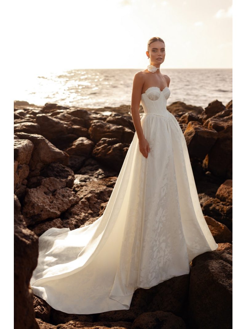 Το φόρεμα Jolene είναι παιχνιδιάρικο, τολμηρό και ιδανικό για μια νύφη που θέλει να εκπλήξει. Το δομημένο τοπ κορσέ με ορατό κόκαλο δημιουργεί ορισμό και στήριξη, ενώ τα φουσκωτά μανίκια με ανοιχτούς ώμους προσδίδουν απαλότητα και ρομαντισμό. Η φούστα σε στρώσεις με κέντημα με τρουκς είναι ανάλαφρη και αβίαστη, δίνοντας σε κάθε κίνηση μια αίσθηση ελευθερίας. Το Jolene είναι φτιαγμένο για νύφες που φαντάζονται την ημέρα του γάμου τους αξέχαστη και διασκεδαστική - ένα φόρεμα που συνδυάζει τη γοητεία με την αυτοπεποίθηση.