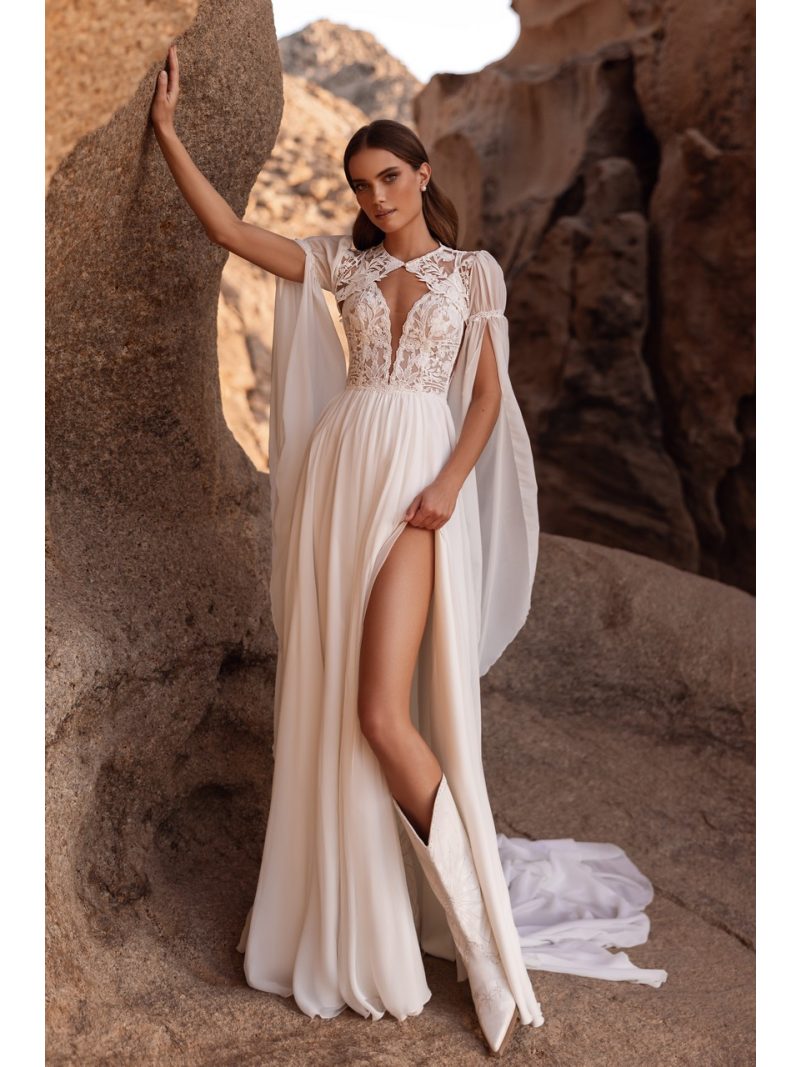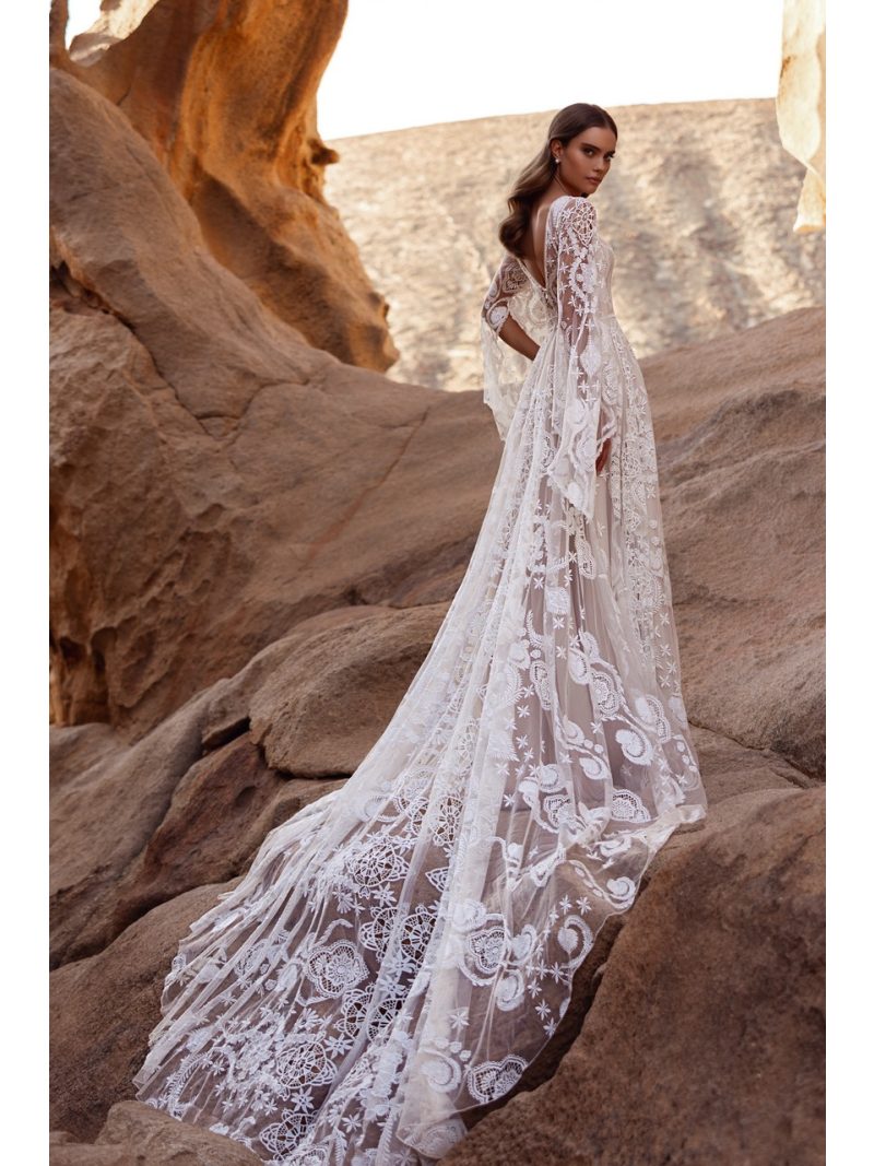 Το Dune είναι ένα νυφικό που απευθύνεται σε νύφες που ονειρεύονται να κάνουν μια δήλωση χωρίς να πουν λέξη. Το φόρεμα χαρακτηρίζεται από την περίτεχνη δαντέλα του, όπου κάθε μοτίβο είναι προσεκτικά τοποθετημένο για να δημιουργήσει βάθος και διάσταση. Τα διάφανα μακριά μανίκια με τις μακριές μανσέτες δίνουν στο φόρεμα μια αίσθηση ελευθερίας και καλλιτεχνίας, ενώ το εφαρμοστό μπούστο αναδεικνύει τη μέση πριν μετατραπεί σε μια μακριά φούστα με μια εντυπωσιακή ουρά. Από κάθε γωνία, το φόρεμα μοιάζει με αριστούργημα — συνδυάζοντας το μποέμικο πνεύμα με την αναμφισβήτητη κομψότητα.