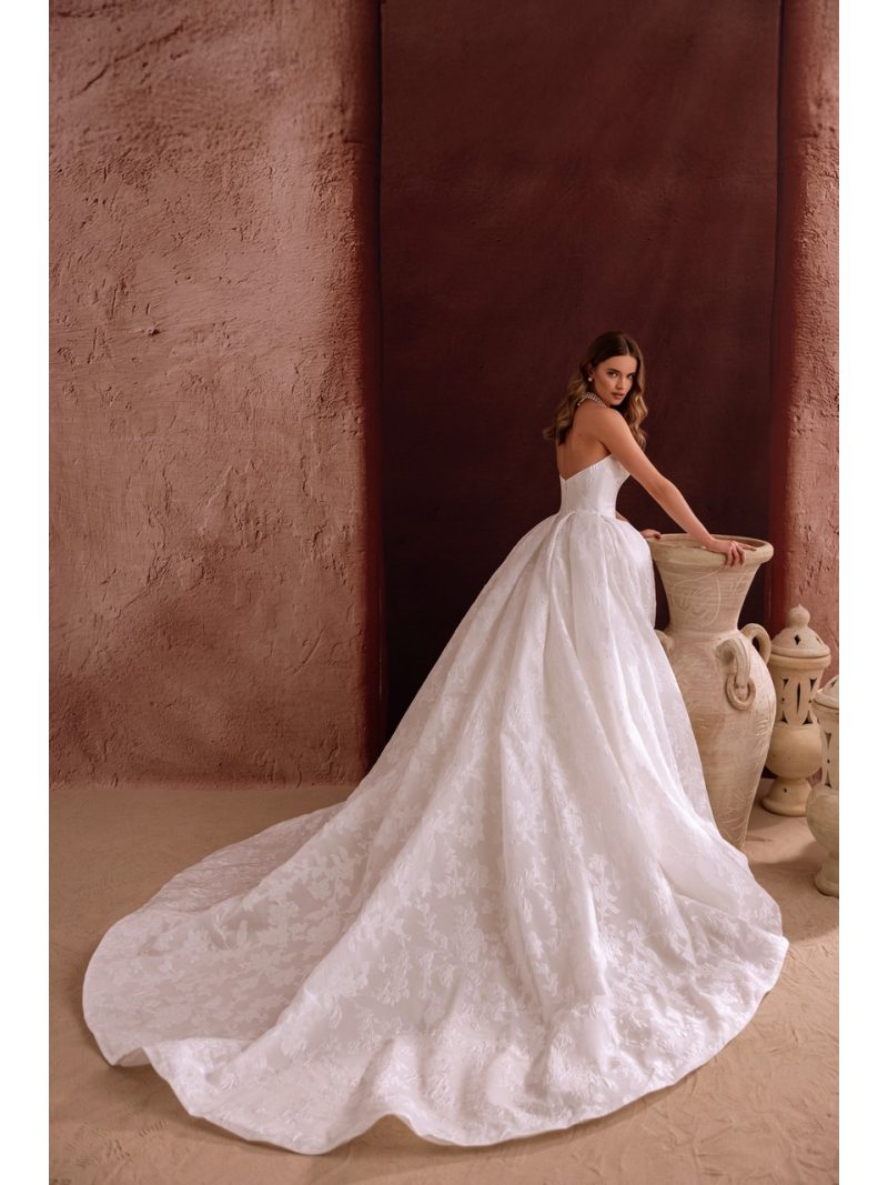 Το Judith είναι το είδος του νυφικού που αφήνει μια αξέχαστη πρώτη εντύπωση. Σχεδιασμένο για νύφες που θέλουν κάτι ρομαντικό αλλά και αβίαστα εντυπωσιακό, συνδυάζει ντελικάτες λεπτομέρειες με ένα ριχτό σχήμα που δίνει ανάλαφρη και χαριτωμένη αίσθηση. Το εφαρμοστό μπούστο διαθέτει φλοράλ δαντέλα με βαθύ ντεκολτέ, προσφέροντας την ιδανική ισορροπία γοητείας και αυτοπεποίθησης. Τα διαφανή μανίκια από σιφόν προσθέτουν απαλότητα και κίνηση, ενώ η ανοιχτή πλάτη τραβάει το βλέμμα και δημιουργεί μια αίσθηση ελευθερίας. Η φούστα ρέει σε μια μακριά ουρά με δαντελένιες λεπτομέρειες κατά μήκος του στριφώματος, αφήνοντας ένα εκπληκτικό φινίρισμα σε κάθε βήμα της διαδρομής.