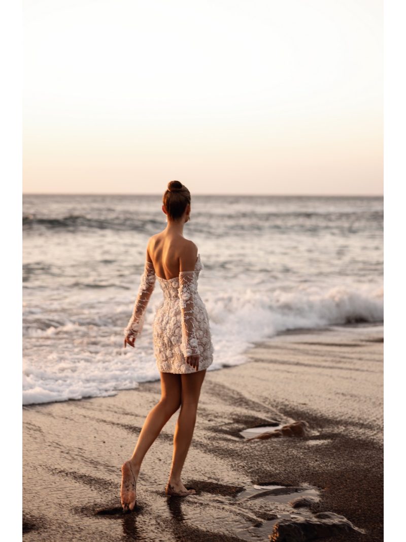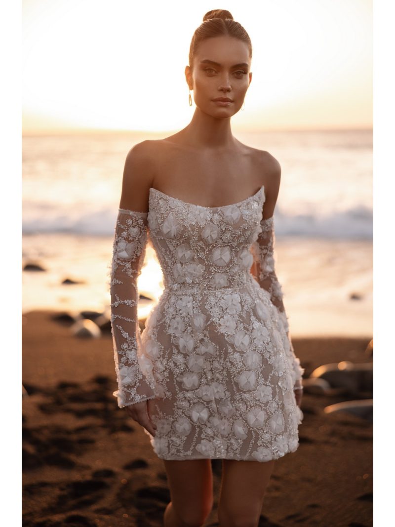 Η Kayla έχει σχεδιαστεί για νύφες που θέλουν να γιορτάσουν την ημέρα τους με στυλ και αυτοπεποίθηση. Αυτό το κοντό νυφικό προσφέρει μια φρέσκια εκδοχή της νυφικής μόδας, ιδανικό για μια τελετή στην παραλία, μια γιορτή στην πόλη ή ως δεύτερο φόρεμα για το βράδυ. Η λαιμόκοψη χωρίς τιράντες πλαισιώνει όμορφα τους ώμους, ενώ το εφαρμοστό μπούστο και τα μακριά διάφανα μανίκια δημιουργούν μια εκλεπτυσμένη ισορροπία. Καλύπτεται από ντελικάτα φλοράλ απλικέ με διακριτική λάμψη, το φόρεμα τραβάει το φως με κάθε κίνηση. Το κοντό του μήκος το κάνει παιχνιδιάρικο αλλά και κομψό, δίνοντάς σας την ελευθερία να χορεύετε και να απολαμβάνετε κάθε στιγμή χωρίς συμβιβασμούς.