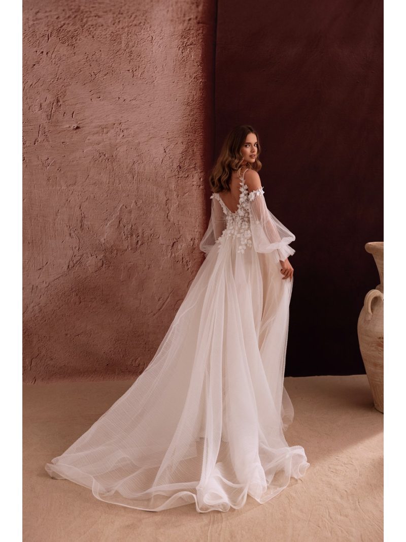 Το Bella είναι ένα νυφικό που γιορτάζει τη θηλυκότητα με ένα τολμηρό και ονειρικό πνεύμα. Το σχέδιο με τους έξω ώμους και το βαθύ ντεκολτέ δημιουργούν ένα σαγηνευτικό σχήμα, ενώ οι αέρινες στρώσεις από τούλι ρέουν σε κάθε βήμα, δίνοντας στο φόρεμα μια αίσθηση ανάλαφρης υφής. Οι φλοράλ πινελιές που τοποθετούνται κατά μήκος του μπούστου και των μανικιών προσθέτουν υφή και ρομαντισμό, φέρνοντας μια απαλή, γλυπτική πινελιά. Ένα ψηλό σκίσιμο ολοκληρώνει την εμφάνιση, συνδυάζοντας τον αισθησιασμό με την ελευθερία κινήσεων. Το Bella είναι για νύφες που θέλουν να νιώσουν αξέχαστες και ελεύθερες, κάνοντας την ημέρα του γάμου τους όχι μόνο όμορφη αλλά πραγματικά δική τους.