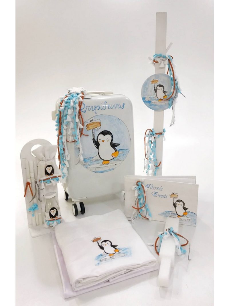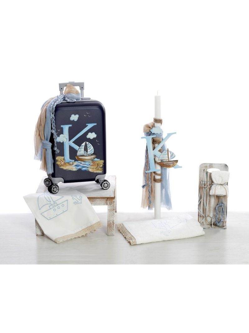 Ολοκληρωμένο βαπτιστικό σετ με ναυτικό θέμα και προσωποποιημένο μονόγραμμα, ιδανικό για μια μοναδική και κομψή βάπτιση. Χειροποίητη διακόσμηση σε αποχρώσεις του μπλε, του μπεζ και του λευκού. Το σετ περιλαμβάνει: ✔ Βαλίτσα τροχήλατη, ζωγραφισμένη στο χέρι με καράβι, κύματα και μονόγραμμα, διακοσμημένη με κορδέλες και λινά στοιχεία. (Διαστάσεις: 57cm x 40cm x 22cm)