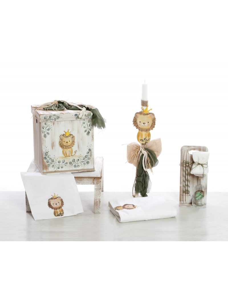 Ολοκληρωμένο βαπτιστικό σετ με θέμα το Λιοντάρι, διακοσμημένο με χειροποίητη ζωγραφική, σε γήινες και φυσικές αποχρώσεις. Ένα κομψό και μοναδικό σετ για μια ξεχωριστή βάπτιση. Το σετ περιλαμβάνει: