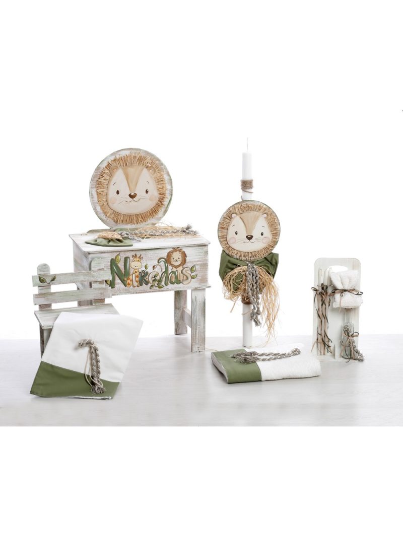 Ολοκληρωμένο βαπτιστικό σετ με θέμα το Λιοντάρι, διακοσμημένο με χειροποίητη ζωγραφική και φυσικά υλικά σε γήινες αποχρώσεις του πράσινου, μπεζ και ξύλου. Ένα ξεχωριστό, rustic σετ για μια μοναδική βάπτιση. Το σετ περιλαμβάνει: