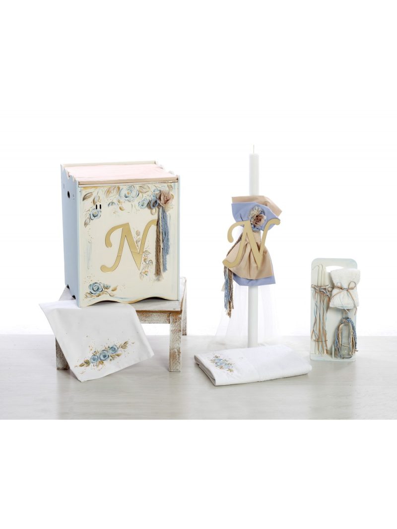 Ολοκληρωμένο βαπτιστικό σετ με μονόγραμμα, διακοσμημένο με χειροποίητη ζωγραφική σε ρομαντικές αποχρώσεις του μπλε, μπεζ και χρυσού. Ένα μοναδικό και διαχρονικό σετ για μια κομψή βάπτιση. Το σετ περιλαμβάνει: