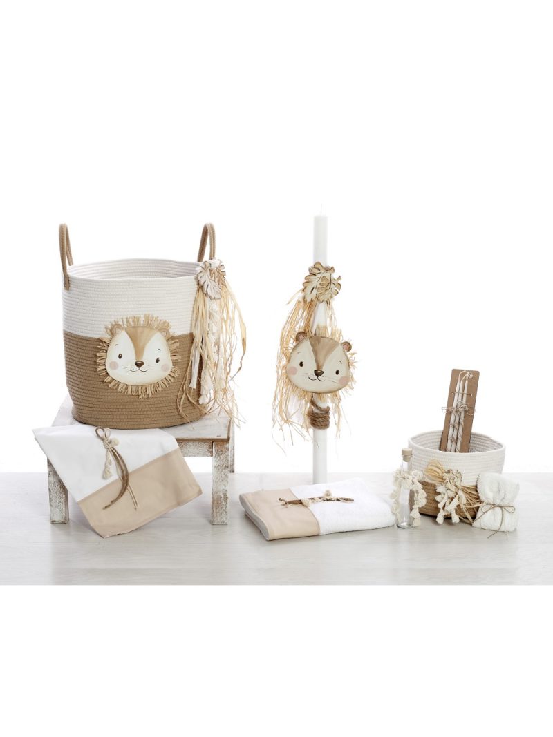 Ολοκληρωμένο βαπτιστικό σετ με θέμα το λιονταράκι, σε γήινες αποχρώσεις.