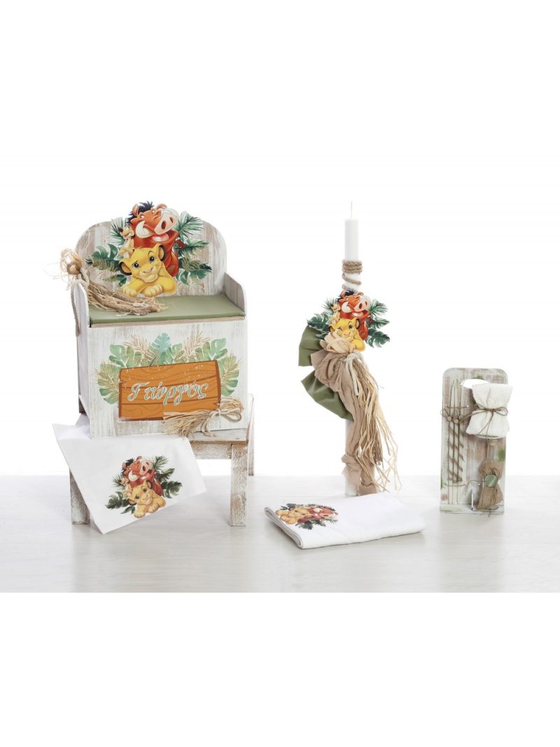Ολοκληρωμένο βαπτιστικό σετ με θέμα τον Lion King, διακοσμημένο με υψηλής ποιότητας UV εκτύπωση και φυσικά υλικά σε jungle ύφος. Μια ιδιαίτερη και εντυπωσιακή επιλογή για μια ξεχωριστή βάπτιση. Το σετ περιλαμβάνει: