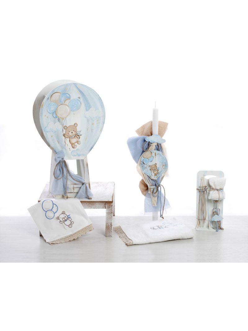 Ολοκληρωμένο βαπτιστικό σετ με θέμα το Αρκουδάκι σε Αερόστατο, διακοσμημένο με χειροποίητη ζωγραφική, σε γαλάζιες και μπεζ αποχρώσεις. Ένα ρομαντικό και ονειρικό σετ για μια ξεχωριστή βάπτιση. Το σετ περιλαμβάνει: