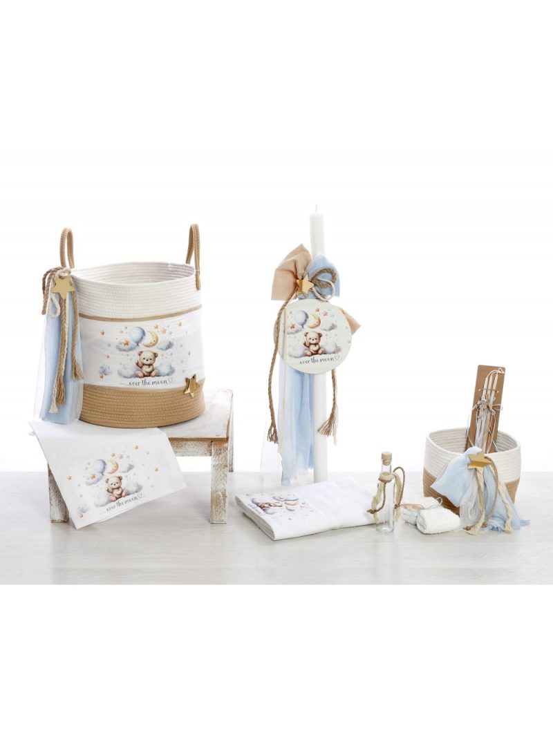 ✔ Λαμπάδα βάπτισης, διακοσμημένη με ξύλινο διακοσμητικό στοιχείο UV εκτύπωσης αρκουδάκι και φεγγάρι, κορδέλες, αστέρια και αέρινα υφάσματα.✔ Λαδόπανα & εσώρουχα, υψηλής ποιότητας, που περιλαμβάνουν: