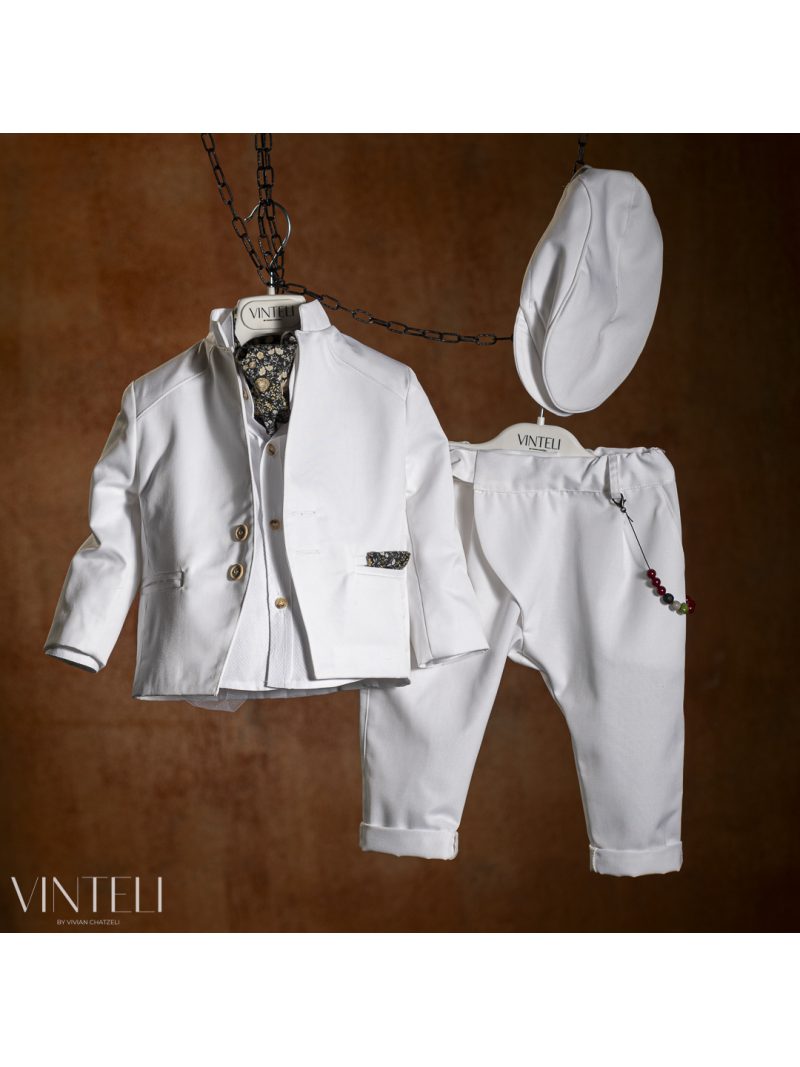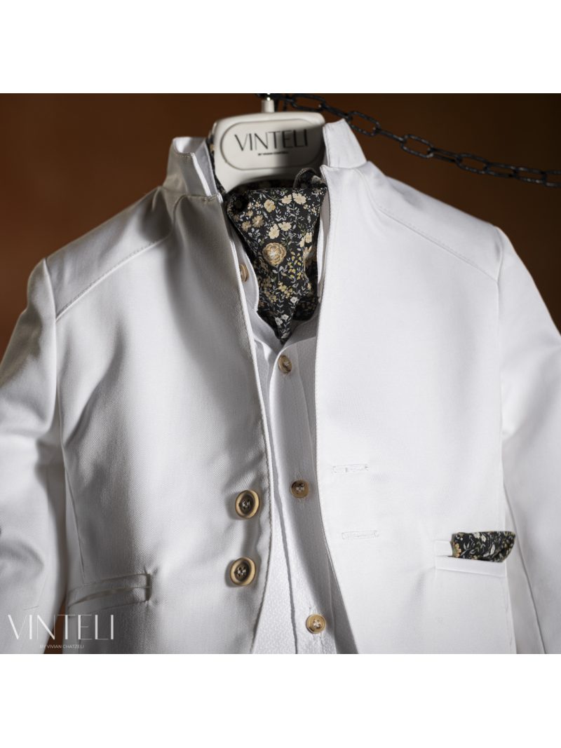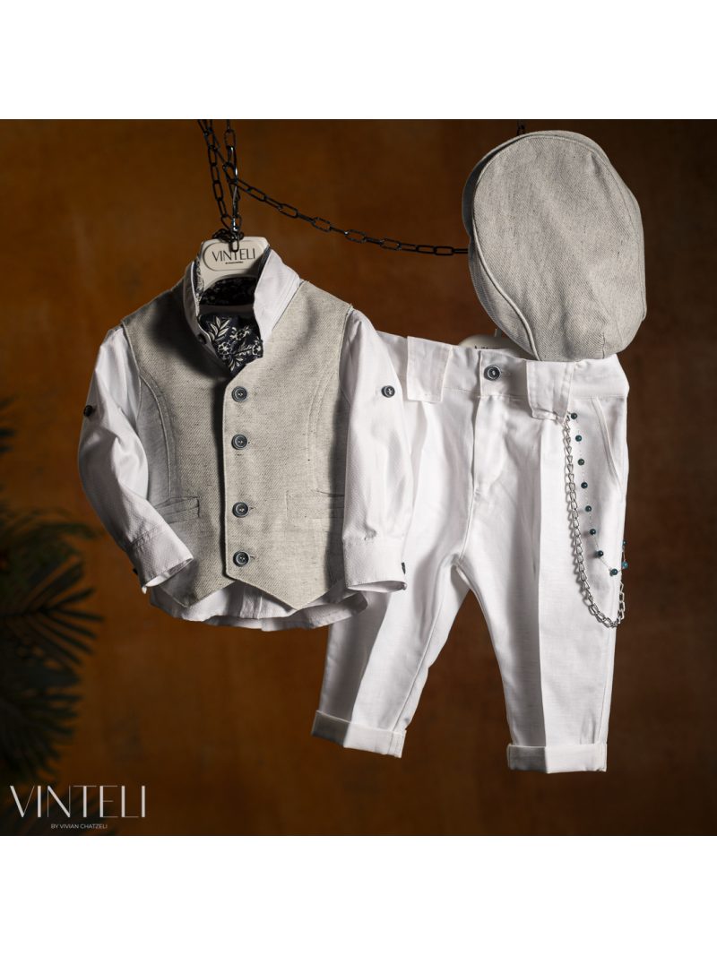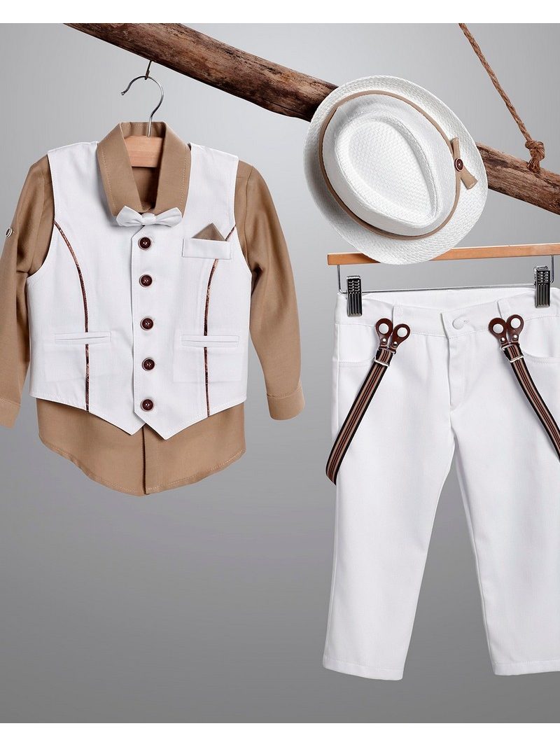 Άσπρη καμπαρντίνα παντελόνι, μπεζ βαμβακερό πουκάμισο και άσπρη καμπαρντίνα γιλέκο.