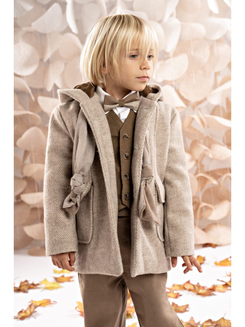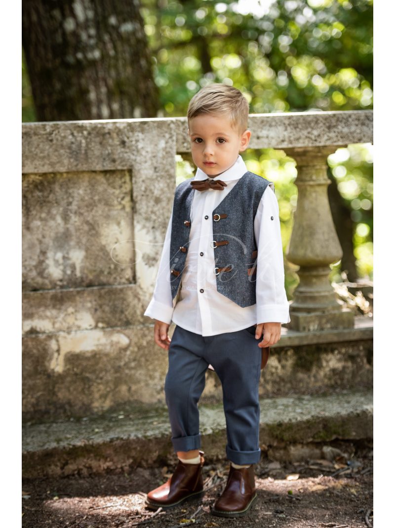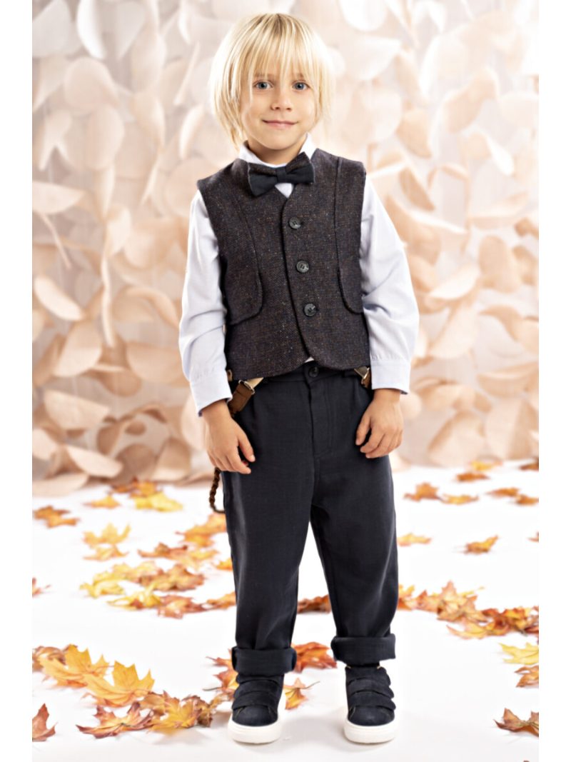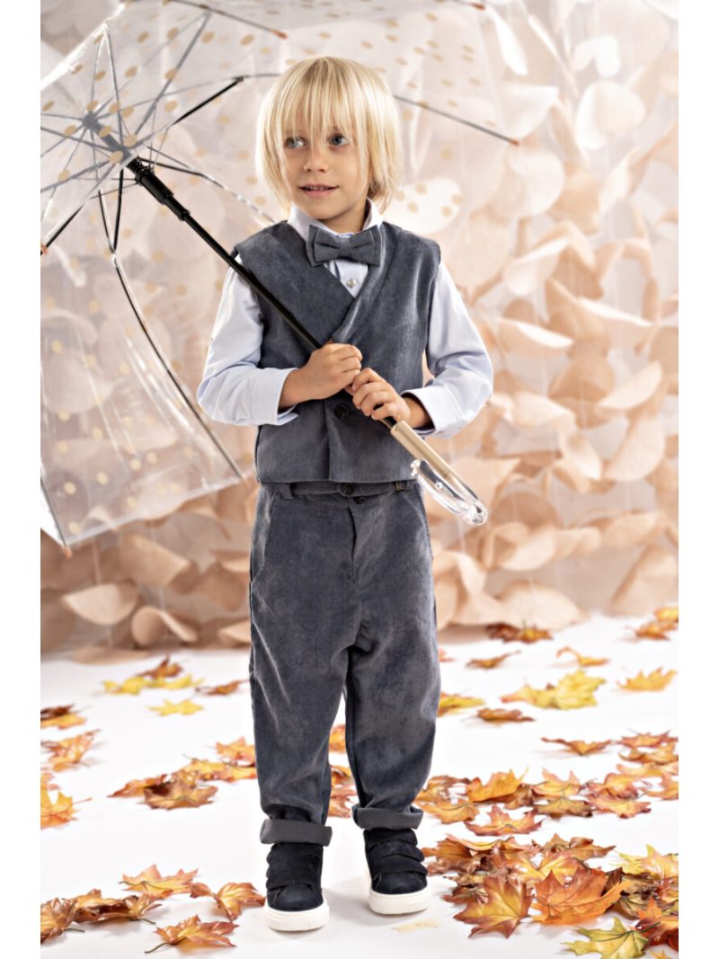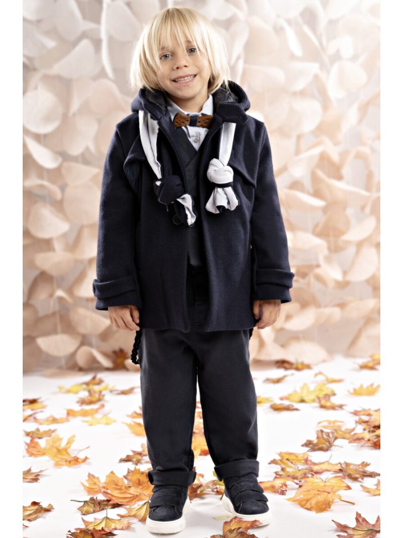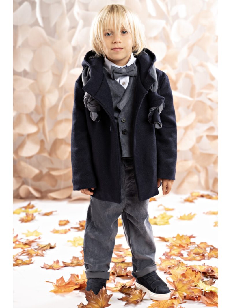 Ένα κομψό σετ για αγόρια, που συνδυάζει κλασικές γραμμές και μοντέρνες λεπτομέρειες. Το σιέλ βαμβακερό πουκάμισο Oxford συνδυάζεται υπέροχα με το σταυρωτό γιλέκο και το παντελόνι σε ίσια γραμμή από κοτλέ σε μπλε-γκρι ραφ απόχρωση. Το ψαροκόκκαλο μάλλινο παλτό σε μπλε navy χρώμα με κουκούλα και εξωτερικές τσέπες προσθέτει ζεστασιά και ολοκληρωμένη στιλιστική εικόνα. Το σετ ολοκληρώνεται τέλεια με παπιγιόν από το ίδιο κοτλέ και το δίχρωμο κασκόλ στην ίδια χρωματική παλέτα.