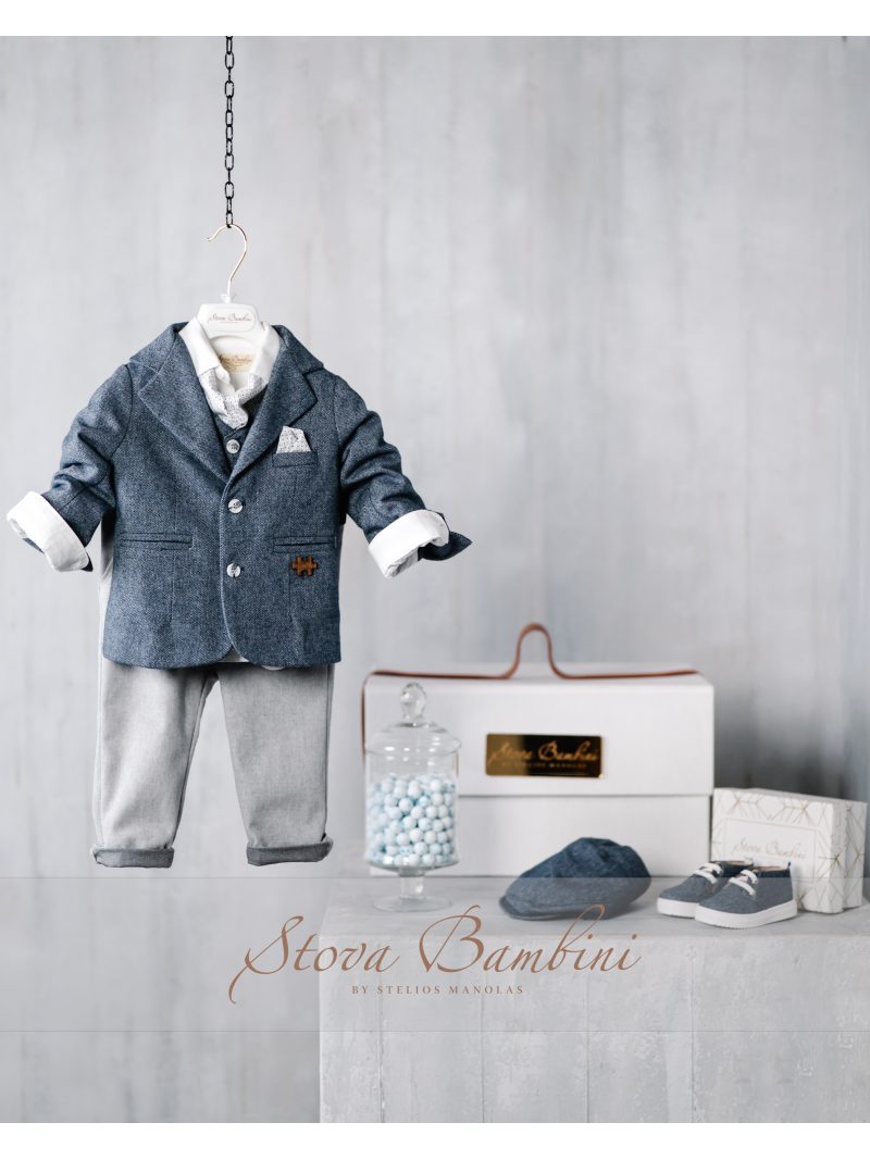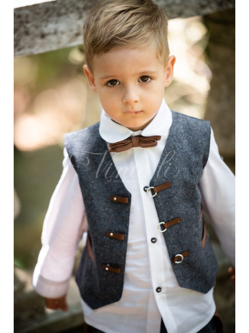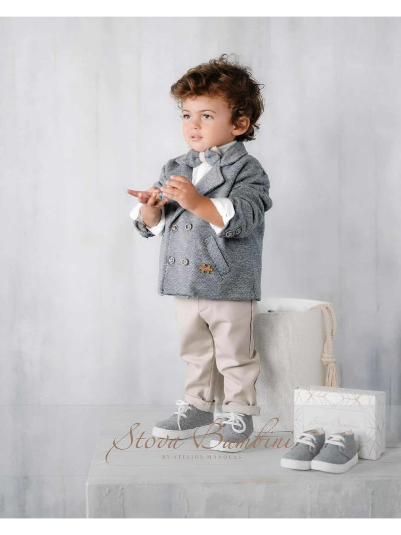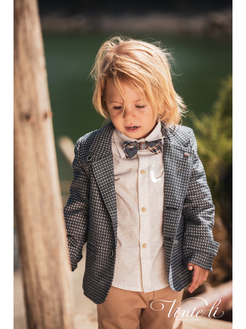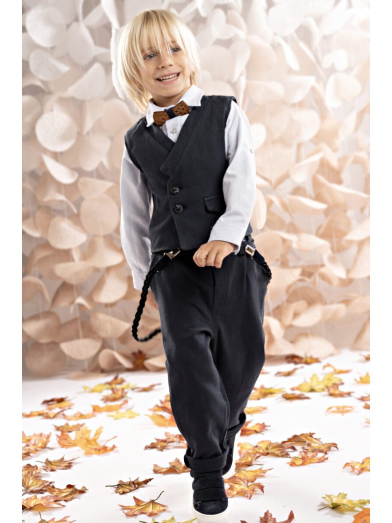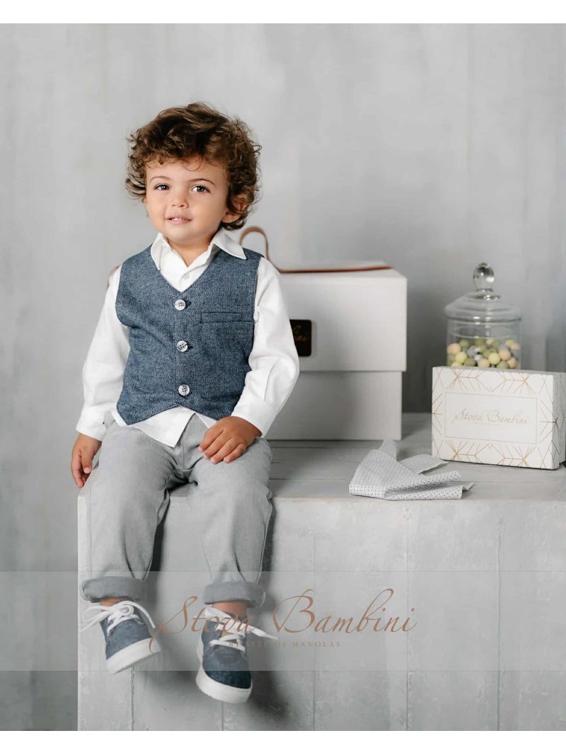Ένα κομψό σετ για αγόρια, που συνδυάζει κλασικές γραμμές και μοντέρνες λεπτομέρειες. Το σιέλ βαμβακερό πουκάμισο Oxford συνδυάζεται υπέροχα με το σταυρωτό γιλέκο και το παντελόνι σε ίσια γραμμή από κοτλέ σε μπλε-γκρι ραφ απόχρωση. Το ψαροκόκκαλο μάλλινο παλτό σε μπλε navy χρώμα με κουκούλα και εξωτερικές τσέπες προσθέτει ζεστασιά και ολοκληρωμένη στιλιστική εικόνα. Το σετ ολοκληρώνεται τέλεια με παπιγιόν από το ίδιο κοτλέ και το δίχρωμο κασκόλ στην ίδια χρωματική παλέτα.