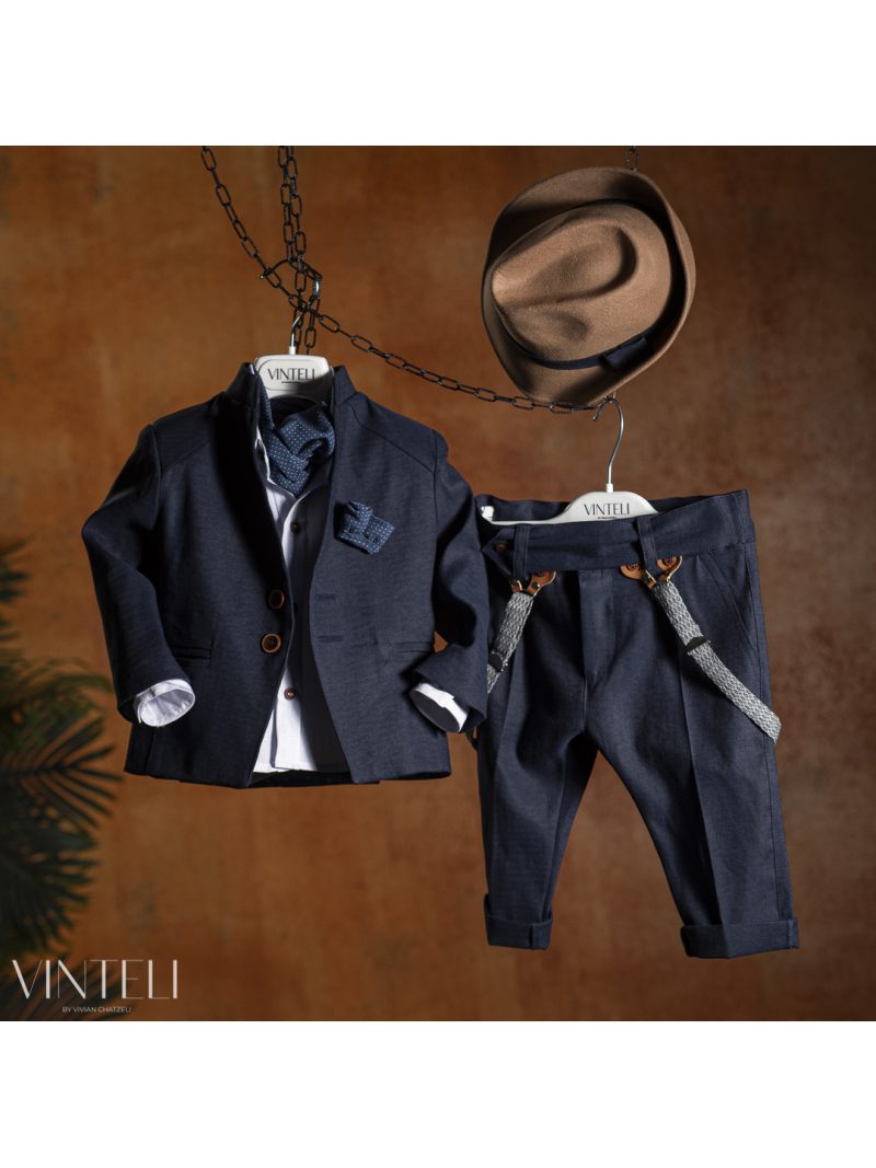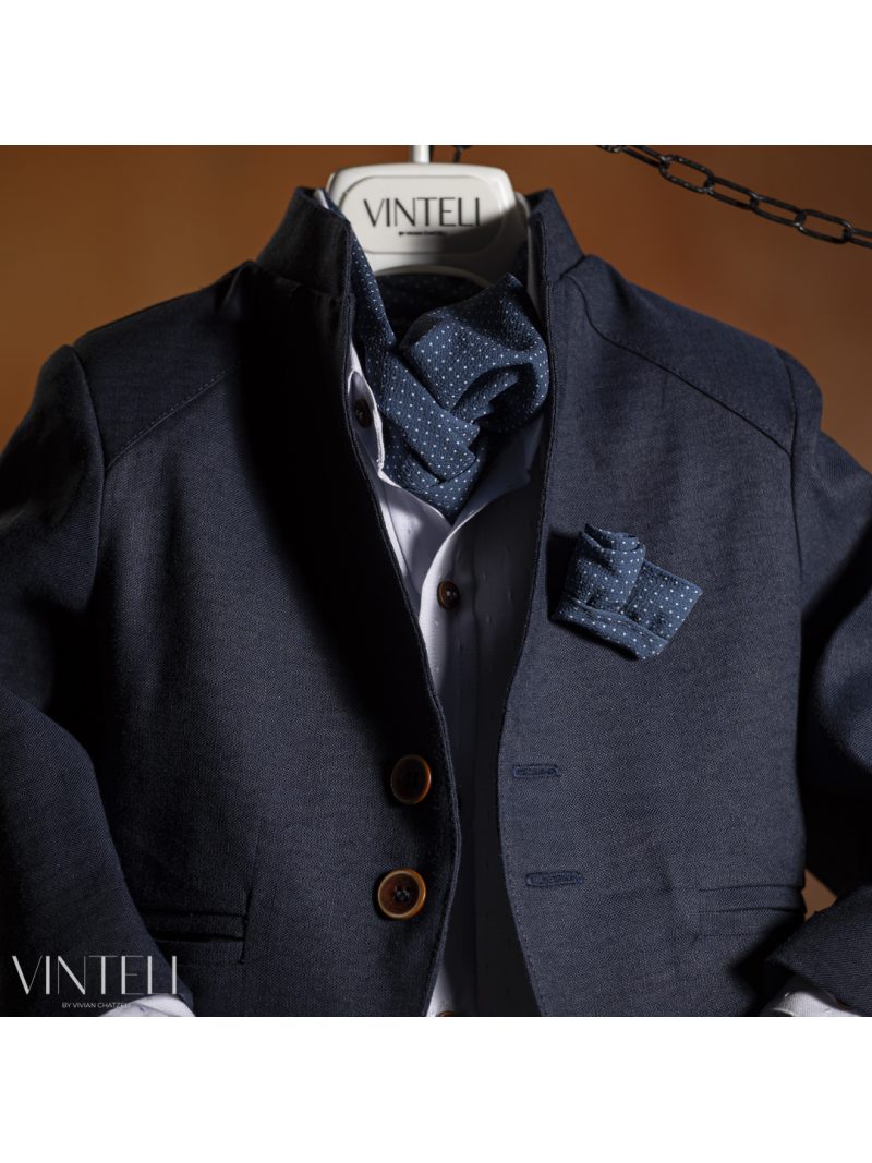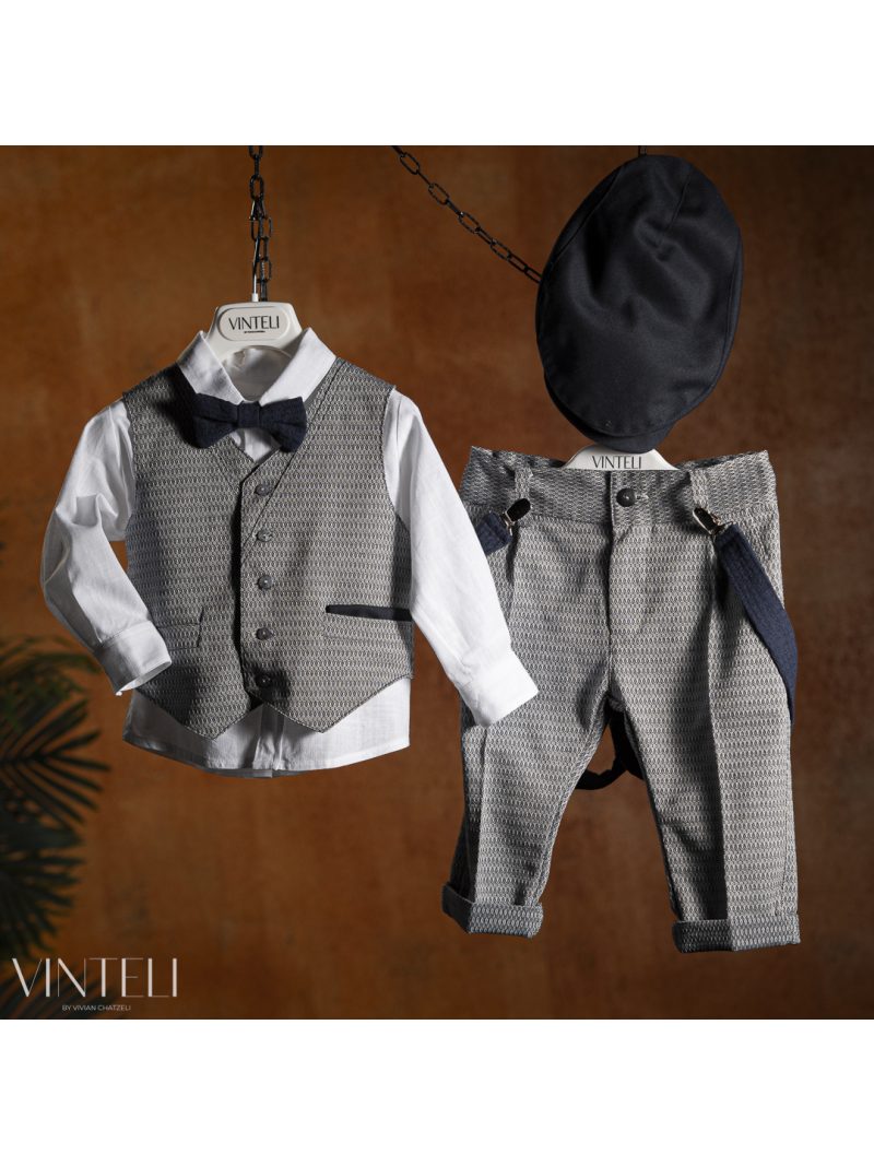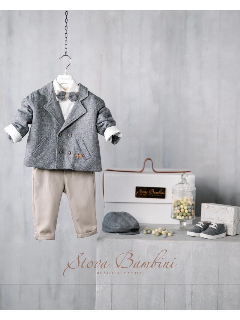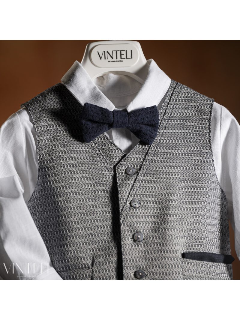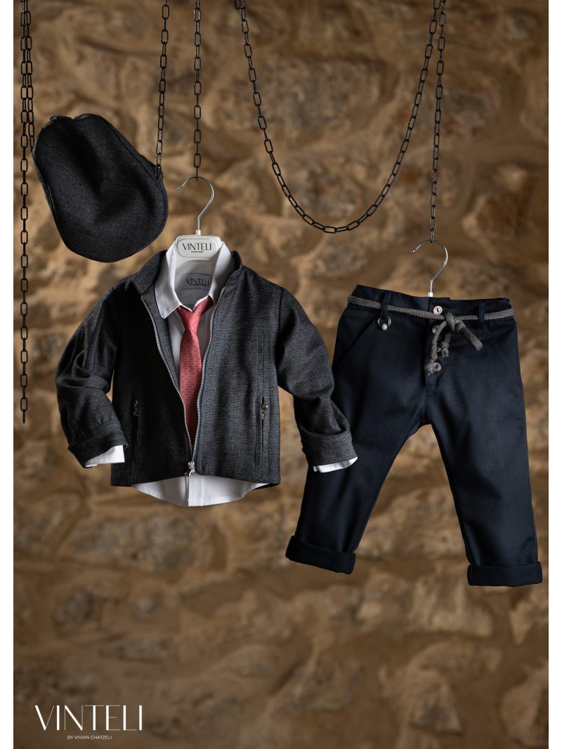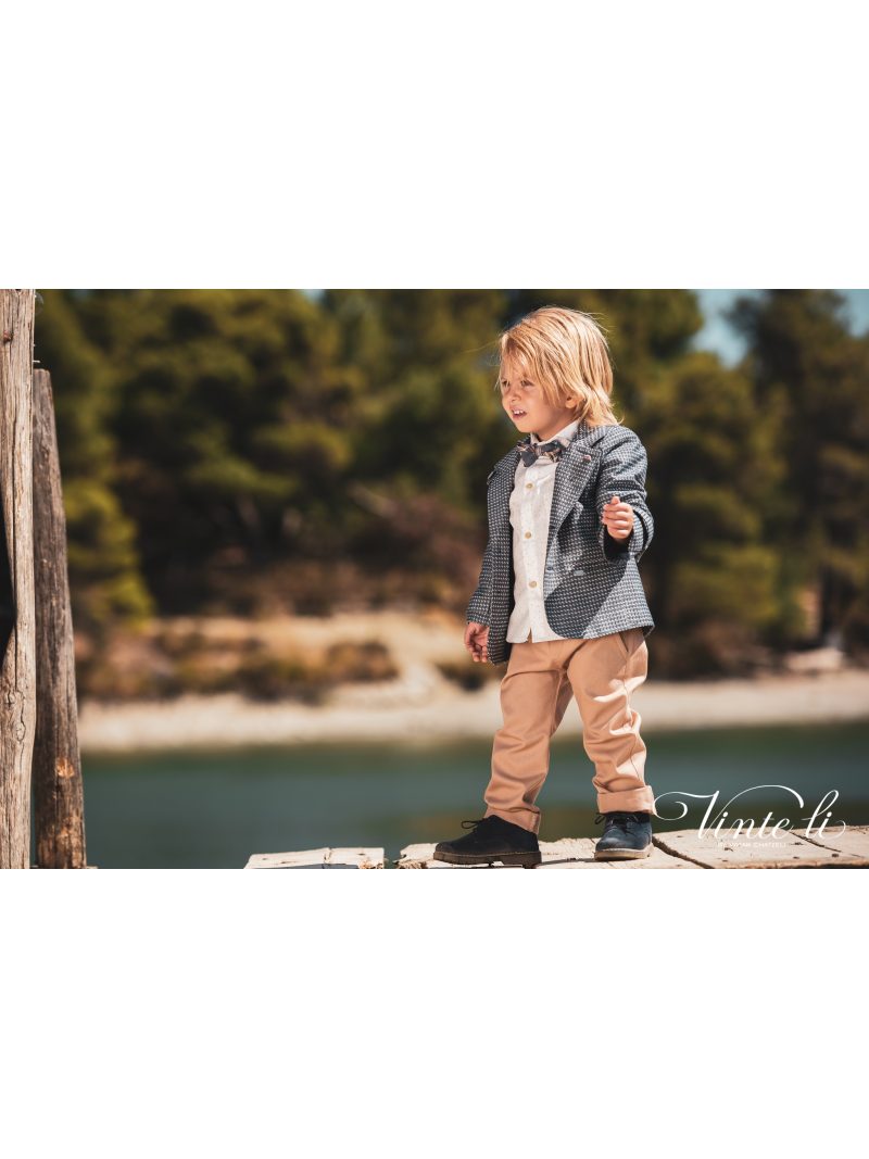 Ένα κομψό σετ για αγόρια, που συνδυάζει κλασικές γραμμές και μοντέρνες λεπτομέρειες. Το σιέλ βαμβακερό πουκάμισο Oxford συνδυάζεται υπέροχα με το σταυρωτό γιλέκο και το παντελόνι σε ίσια γραμμή από κοτλέ σε μπλε-γκρι ραφ απόχρωση. Το ψαροκόκκαλο μάλλινο παλτό σε μπλε navy χρώμα με κουκούλα και εξωτερικές τσέπες προσθέτει ζεστασιά και ολοκληρωμένη στιλιστική εικόνα. Το σετ ολοκληρώνεται τέλεια με παπιγιόν από το ίδιο κοτλέ και το δίχρωμο κασκόλ στην ίδια χρωματική παλέτα.