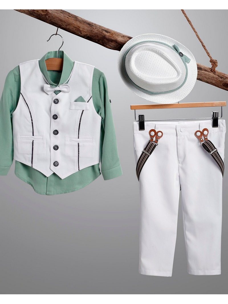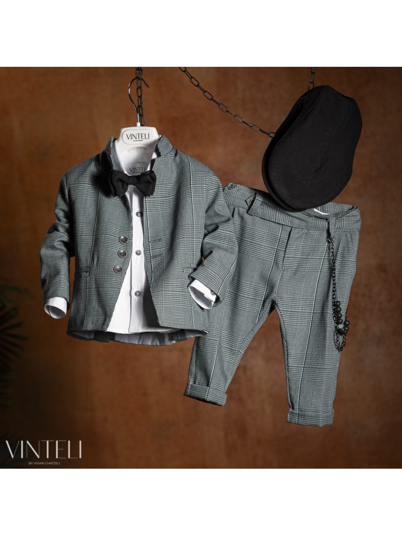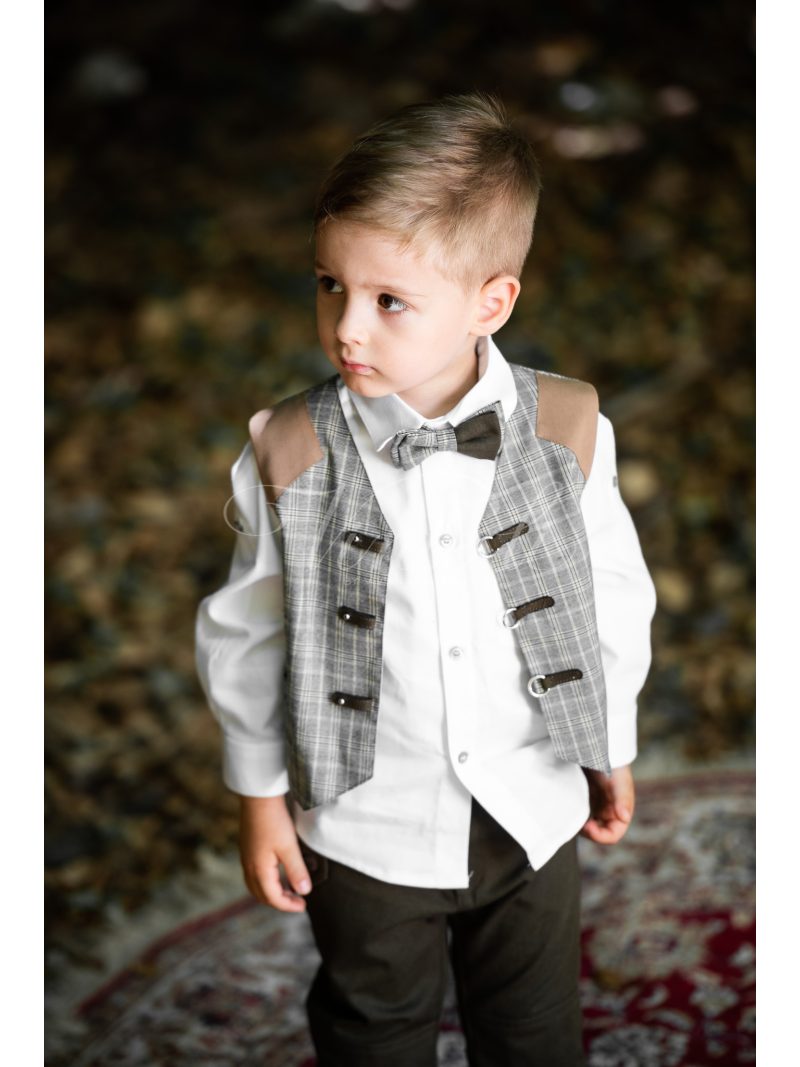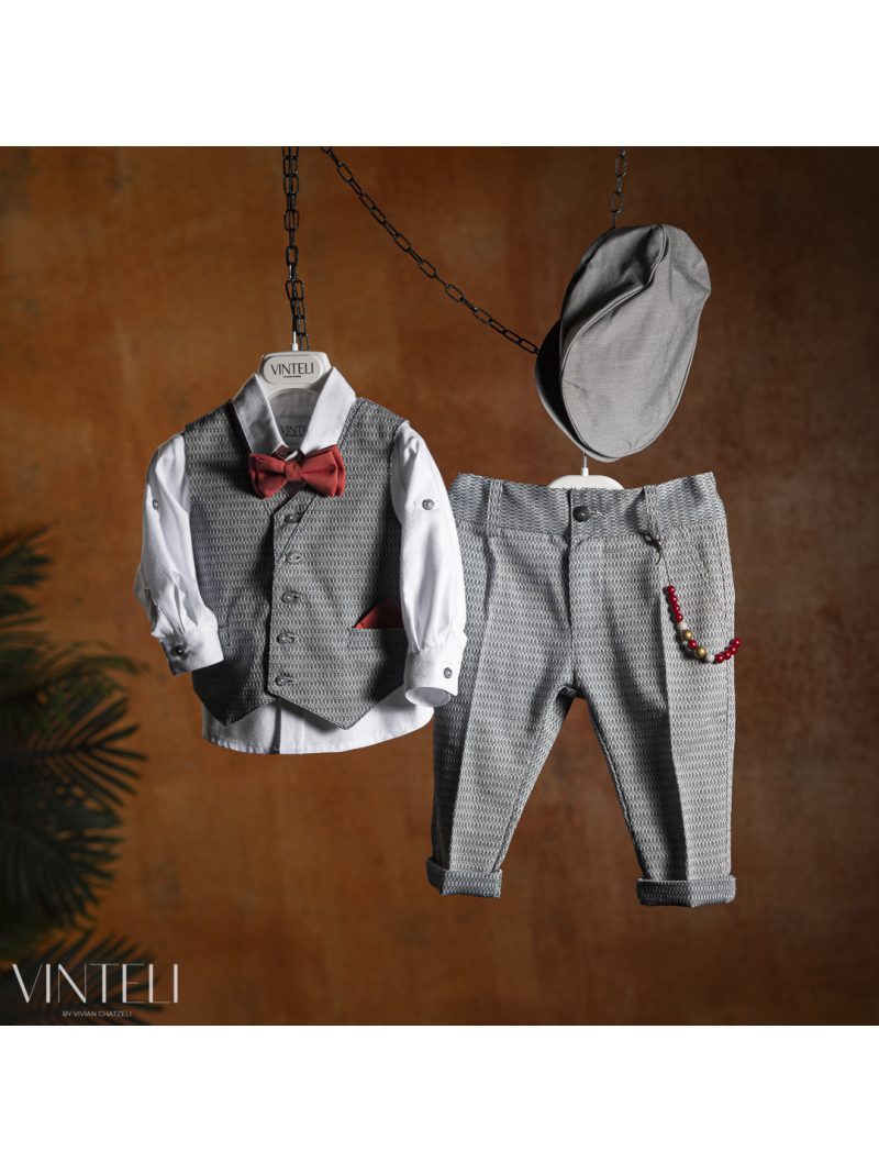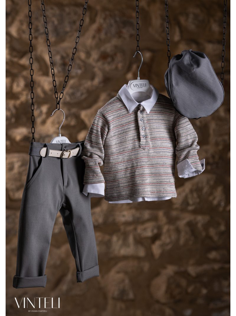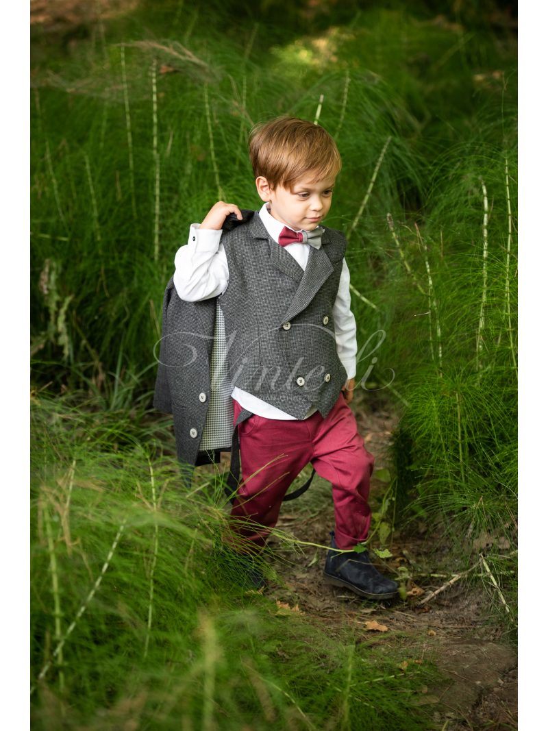 Ένα κομψό σετ για αγόρια, που συνδυάζει κλασικές γραμμές και μοντέρνες λεπτομέρειες. Το σιέλ βαμβακερό πουκάμισο Oxford συνδυάζεται υπέροχα με το σταυρωτό γιλέκο και το παντελόνι σε ίσια γραμμή από κοτλέ σε μπλε-γκρι ραφ απόχρωση. Το ψαροκόκκαλο μάλλινο παλτό σε μπλε navy χρώμα με κουκούλα και εξωτερικές τσέπες προσθέτει ζεστασιά και ολοκληρωμένη στιλιστική εικόνα. Το σετ ολοκληρώνεται τέλεια με παπιγιόν από το ίδιο κοτλέ και το δίχρωμο κασκόλ στην ίδια χρωματική παλέτα.