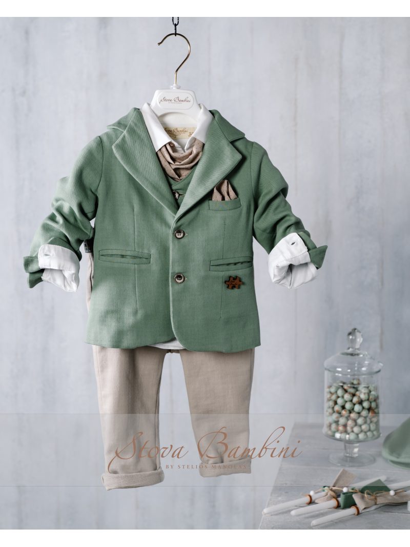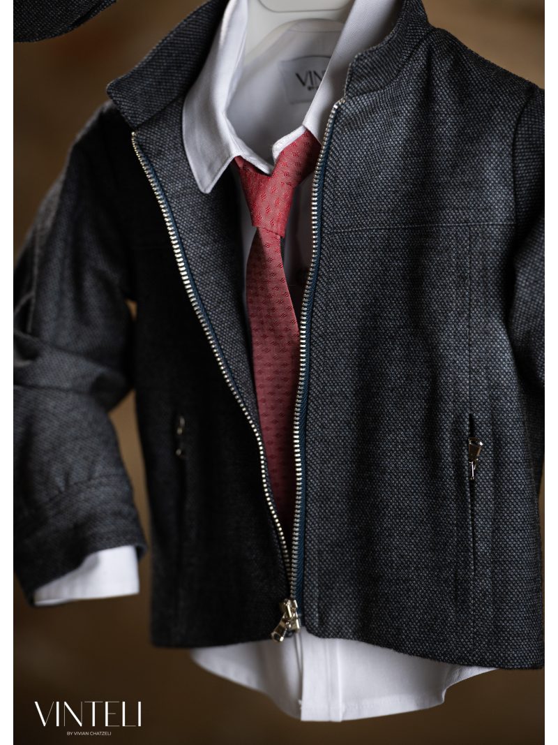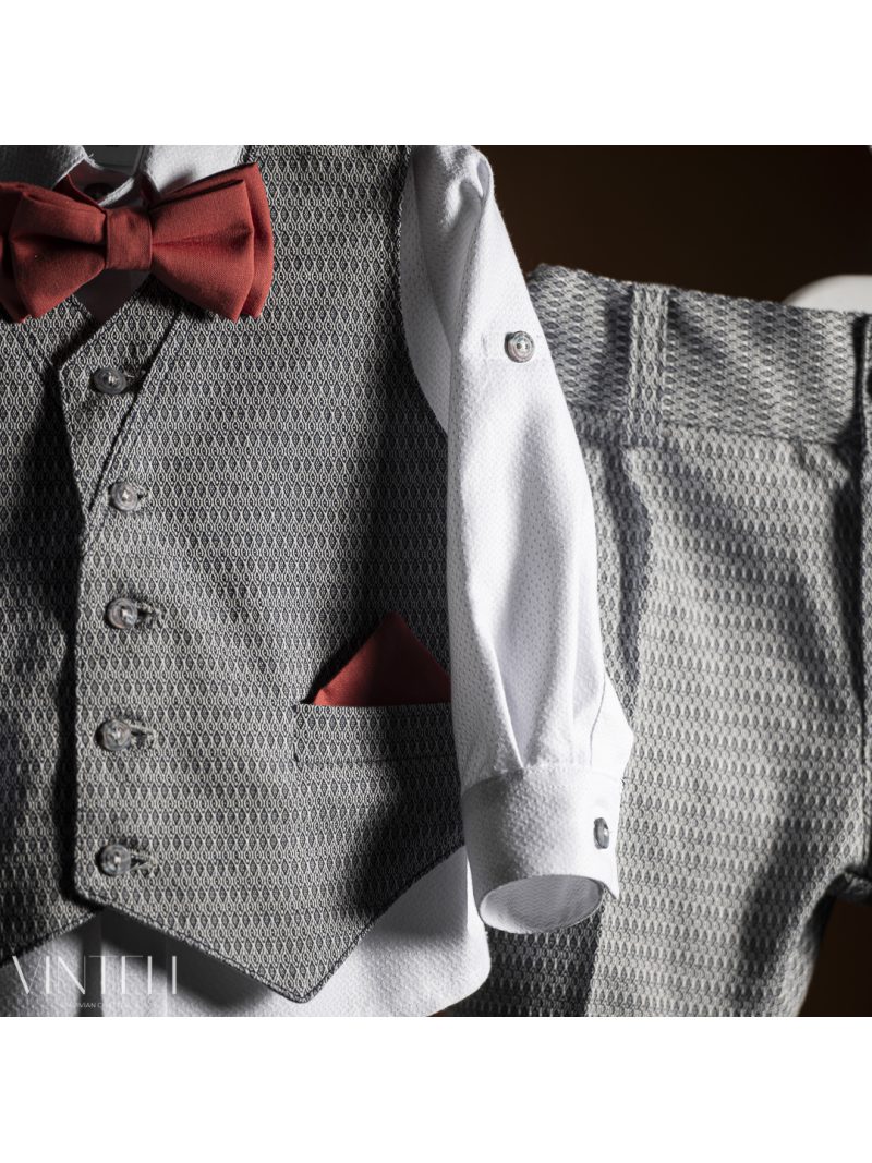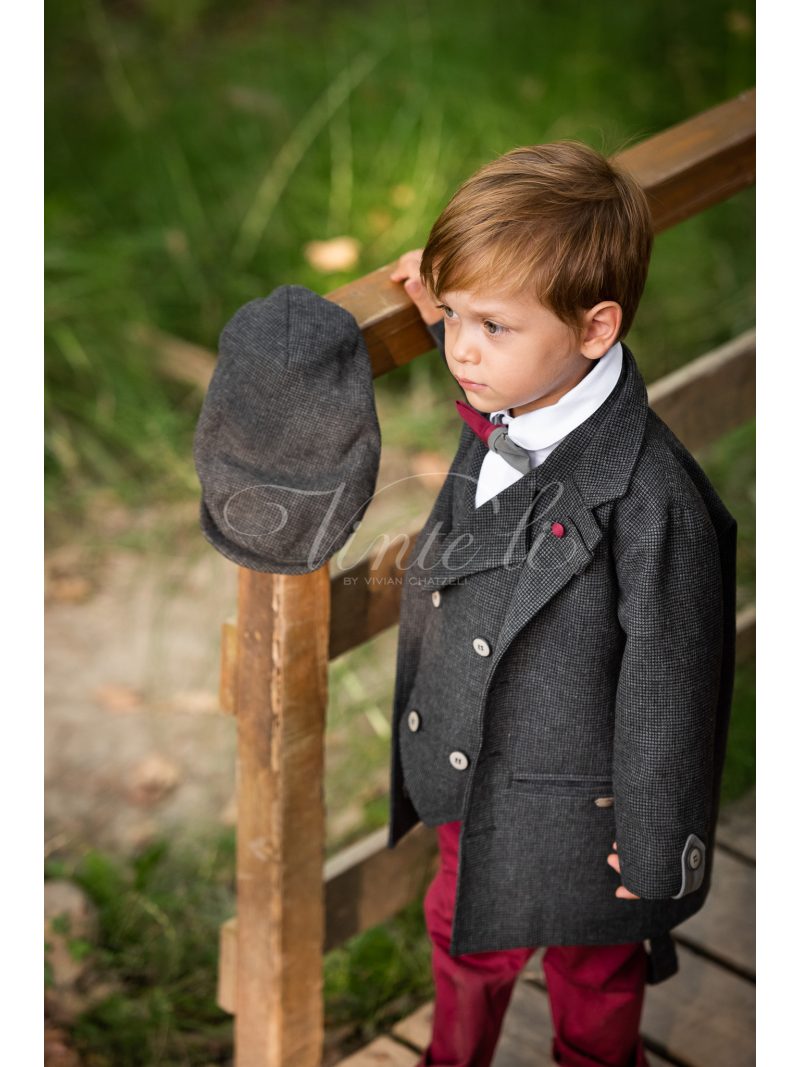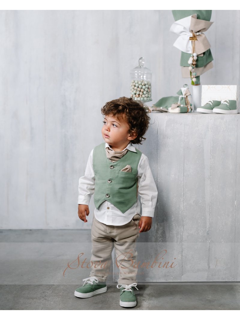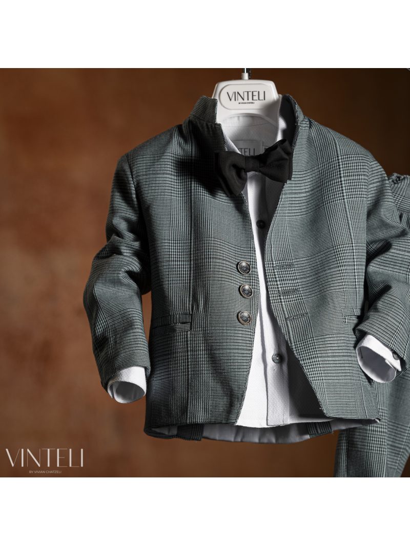 Ένα κομψό σετ για αγόρια, που συνδυάζει κλασικές γραμμές και μοντέρνες λεπτομέρειες. Το σιέλ βαμβακερό πουκάμισο Oxford συνδυάζεται υπέροχα με το σταυρωτό γιλέκο και το παντελόνι σε ίσια γραμμή από κοτλέ σε μπλε-γκρι ραφ απόχρωση. Το ψαροκόκκαλο μάλλινο παλτό σε μπλε navy χρώμα με κουκούλα και εξωτερικές τσέπες προσθέτει ζεστασιά και ολοκληρωμένη στιλιστική εικόνα. Το σετ ολοκληρώνεται τέλεια με παπιγιόν από το ίδιο κοτλέ και το δίχρωμο κασκόλ στην ίδια χρωματική παλέτα.
