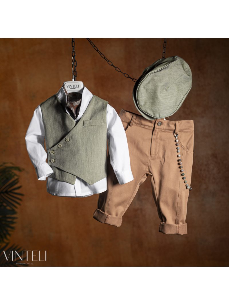 Εμπνευσμένο από τις φθινοπωρινές αποχρώσεις του λαδί-χακί, αυτό το υπέροχο σετ συνδυάζει αρμονικά, το λευκό βαμβακερό πουκάμισο, το μάλλινο γιλέκο με diagonal πλέξη σε απαλή γκρι-λαδί απόχρωση και δίχρωμη πλάτη, το παντελόνι σε ίσια γραμμή από λαδί κοτλέ ύφασμα. Το σύνολο ολοκληρώνει το καπιτονέ κοτλέ παλτό στις ίδιες αποχρώσεις, με κουκούλα, ωμίτες και τσέπες φιλέτο, προσφέροντας ζεστασιά και στιλ. Το δίχρωμο παπιγιόν και το δίχρωμο κασκόλ στην ίδια παλέτα προσθέτουν την τελευταία πινελιά, δημιουργώντας ένα σετ κομψό έτοιμο για χειμερινές εξορμήσεις.