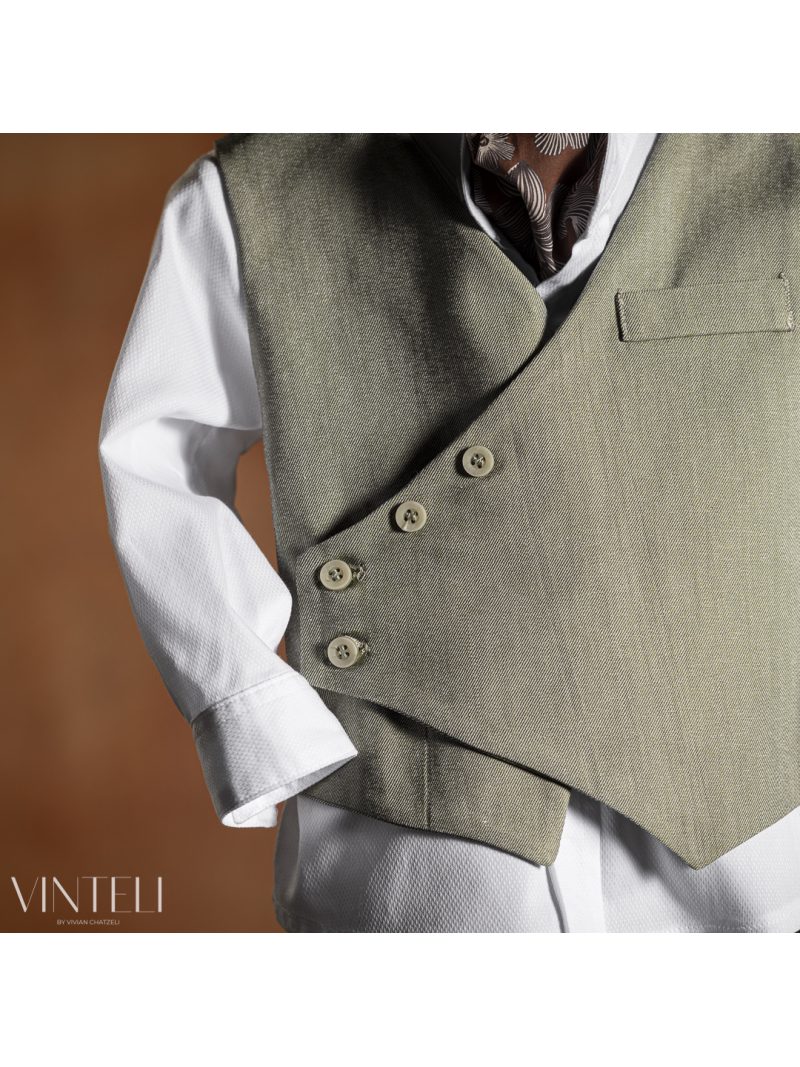 Άσπρη καμπαρντίνα παντελόνι, βεραμάν βαμβακερό πουκάμισο και άσπρη καμπαρντίνα γιλέκο.