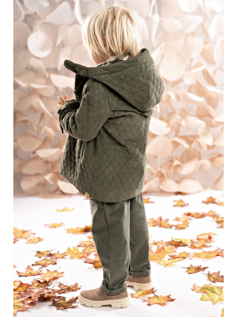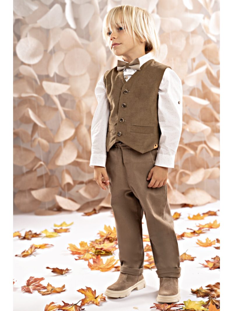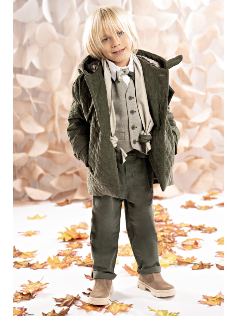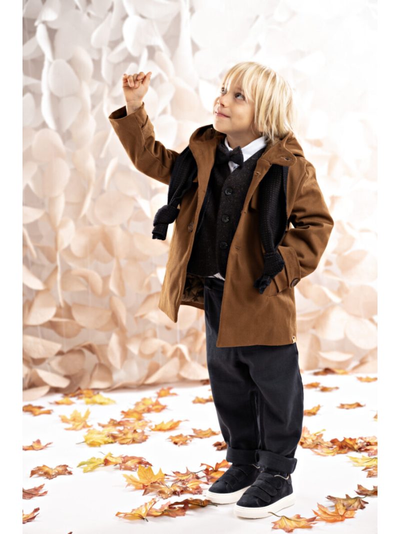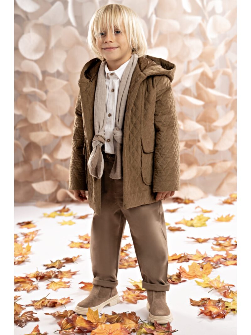 Ένα όμορφο σετ για αγόρια που ξεπήδησε από τις μικρές χειμερινές μας ιστορίες. Το λευκό βαμβακερό πουκάμισο συνδυάζεται με παντελόνι σε ίσια γραμμή από βαμβακερή καπαρντίνα σε ζεστή απόχρωση καφέ μόκα. Το κοτλέ καπιτονέ ημίπαλτο σε εξίσου καφέ χρώμα, με κουκούλα, εξωτερικές τσέπες και σατέν καπιτονέ φόδρα, προσθέτει στο σύνολο μια παιχνιδιάρικη και casual αίσθηση. Το δίχρωμο κασκόλ στις ίδιες αποχρώσεις είναι η τελευταία πινελιά για να ολοκληρωθεί το look.