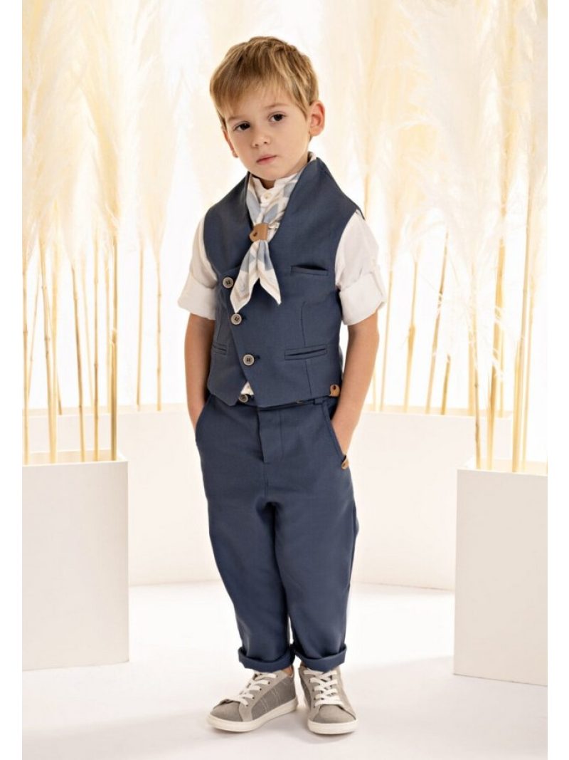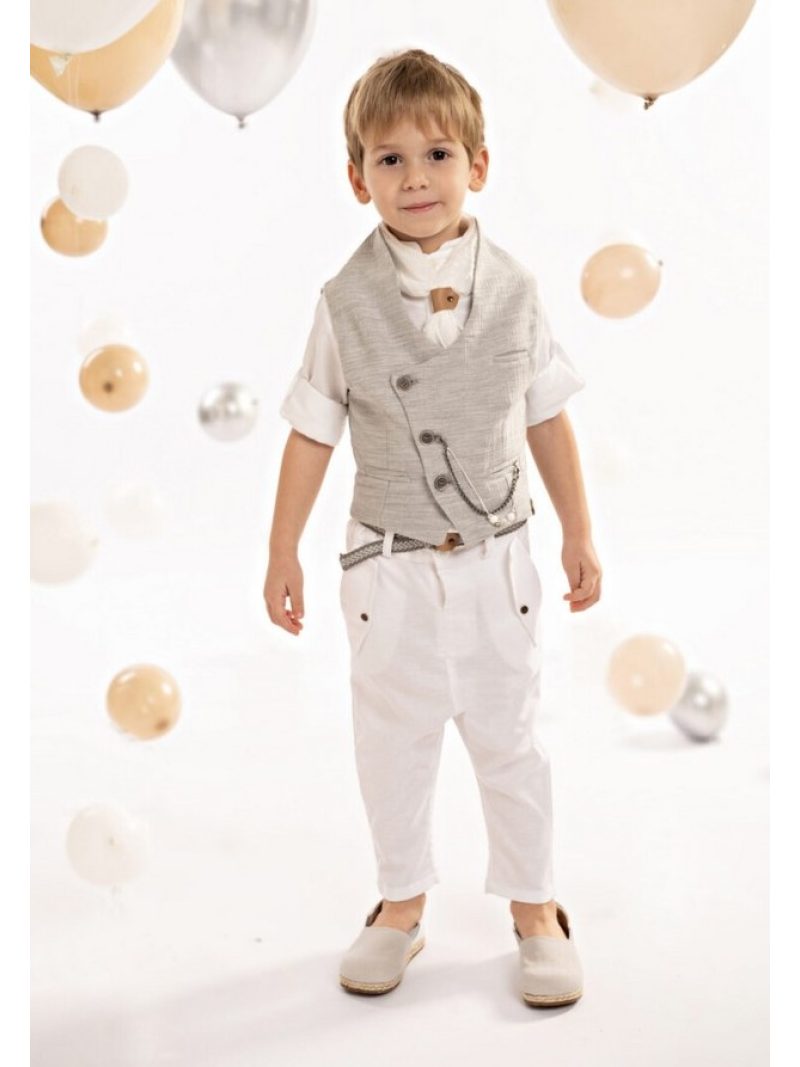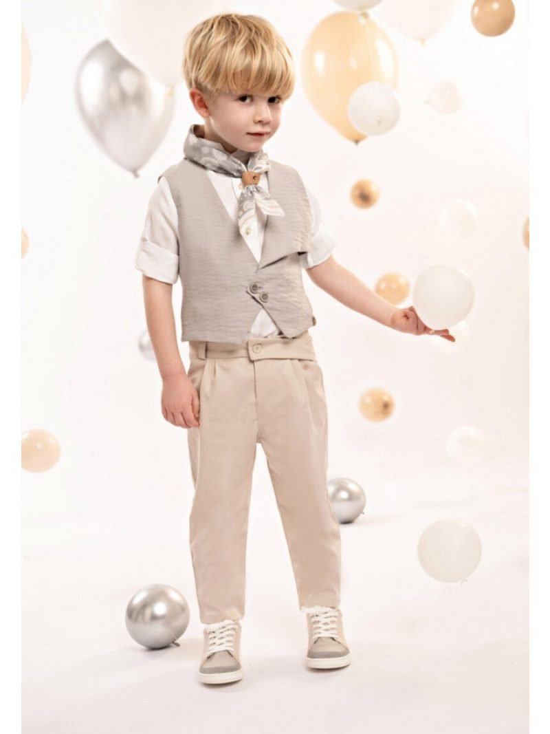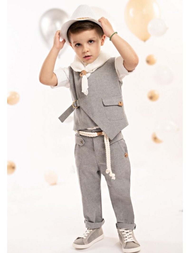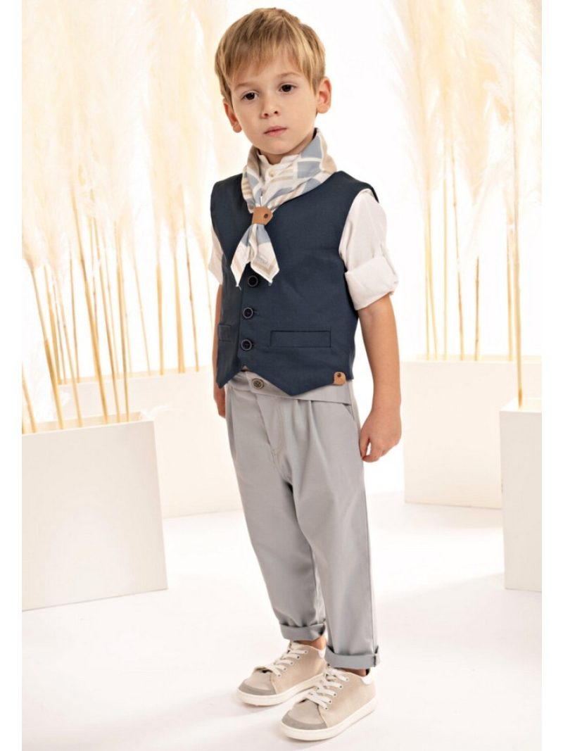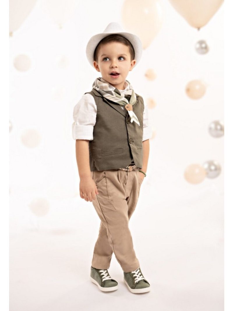 Ένα σύνολο με άψογη αισθητική, ιδανικό για μικρούς τζέντλεμεν! Σε αποχρώσεις του cobalt blue, το βαμβακερό καμβαδένιο παντελόνι διαθέτει ιδιαίτερη λεπτομέρεια στο ζωνάκι, ενώ το γιλέκο, με το λοξό κούμπωμα και τις τσέπες φιλέτο, προσδίδει σύγχρονη κομψότητα. Το βαμβακερό πουκάμισο σε off white απόχρωση ξεχωρίζει με τον ιδιαίτερο Mao γιακά του, προσφέροντας ένα σύγχρονο twist στο κλασικό ύφος. Το personalized βουάλ φουλάρι με γεωμετρικά μοτίβα σε σιέλ και μπεζ τόνους προσθέτει μια παιχνιδιάρικη πινελιά, ενώ η επιλογή ανάμεσα σε ψάθινο καπέλο ή κομψή τραγιάσκα ολοκληρώνει το look με στιλ και φινέτσα.