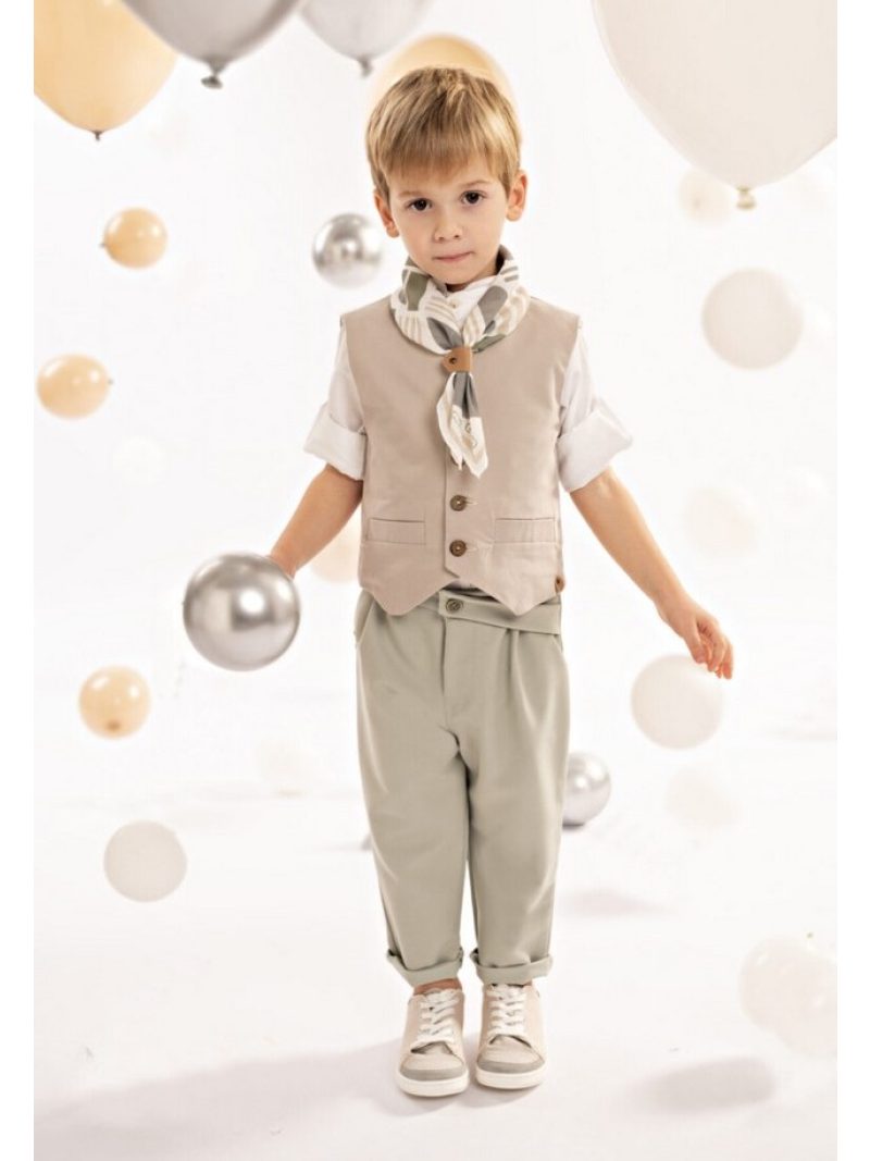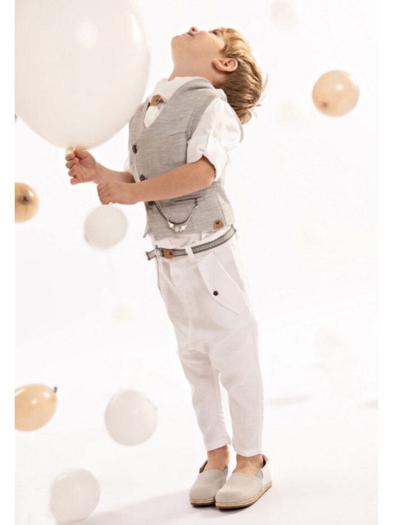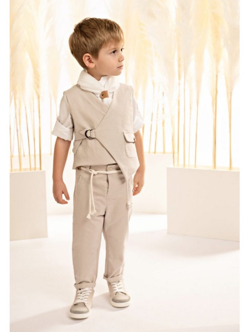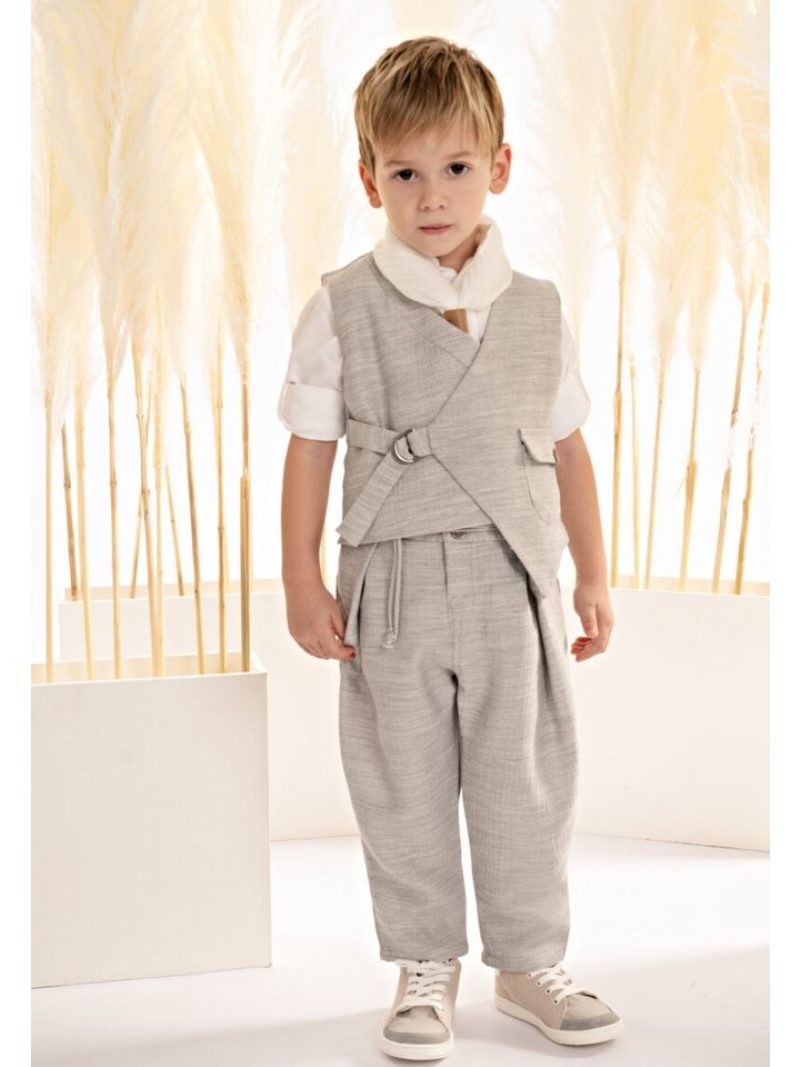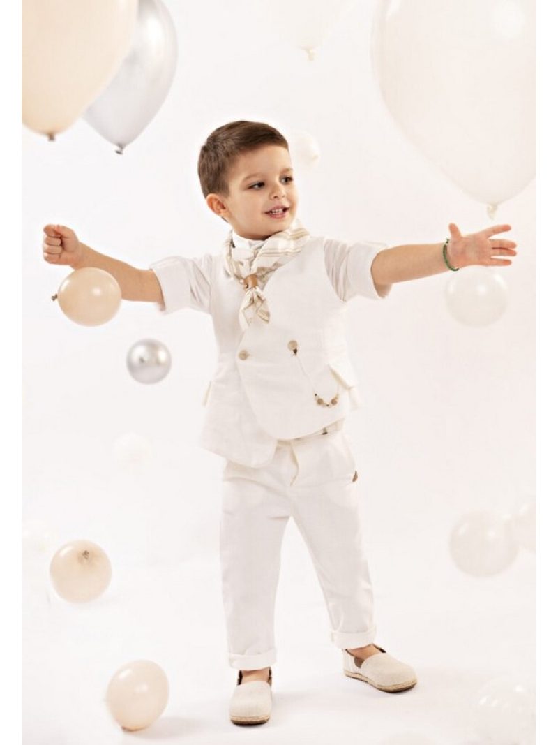 Ένα σύνολο με άψογη αισθητική, ιδανικό για μικρούς τζέντλεμεν! Σε αποχρώσεις του cobalt blue, το βαμβακερό καμβαδένιο παντελόνι διαθέτει ιδιαίτερη λεπτομέρεια στο ζωνάκι, ενώ το γιλέκο, με το λοξό κούμπωμα και τις τσέπες φιλέτο, προσδίδει σύγχρονη κομψότητα. Το βαμβακερό πουκάμισο σε off white απόχρωση ξεχωρίζει με τον ιδιαίτερο Mao γιακά του, προσφέροντας ένα σύγχρονο twist στο κλασικό ύφος. Το personalized βουάλ φουλάρι με γεωμετρικά μοτίβα σε σιέλ και μπεζ τόνους προσθέτει μια παιχνιδιάρικη πινελιά, ενώ η επιλογή ανάμεσα σε ψάθινο καπέλο ή κομψή τραγιάσκα ολοκληρώνει το look με στιλ και φινέτσα.