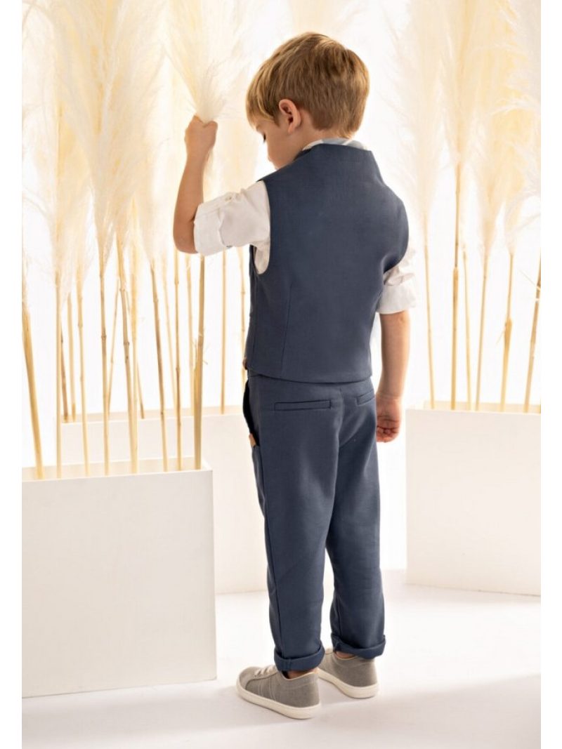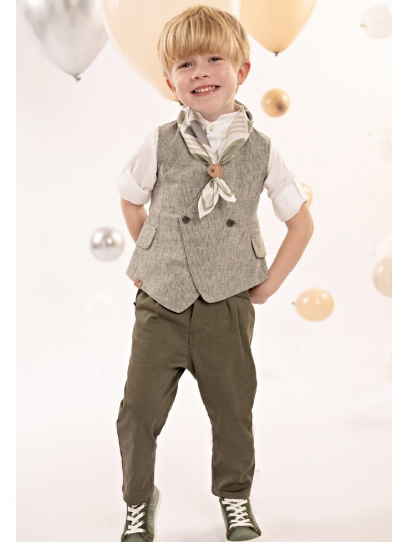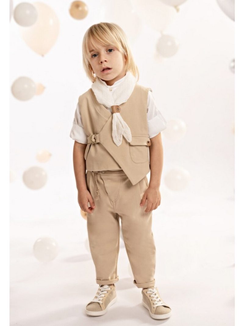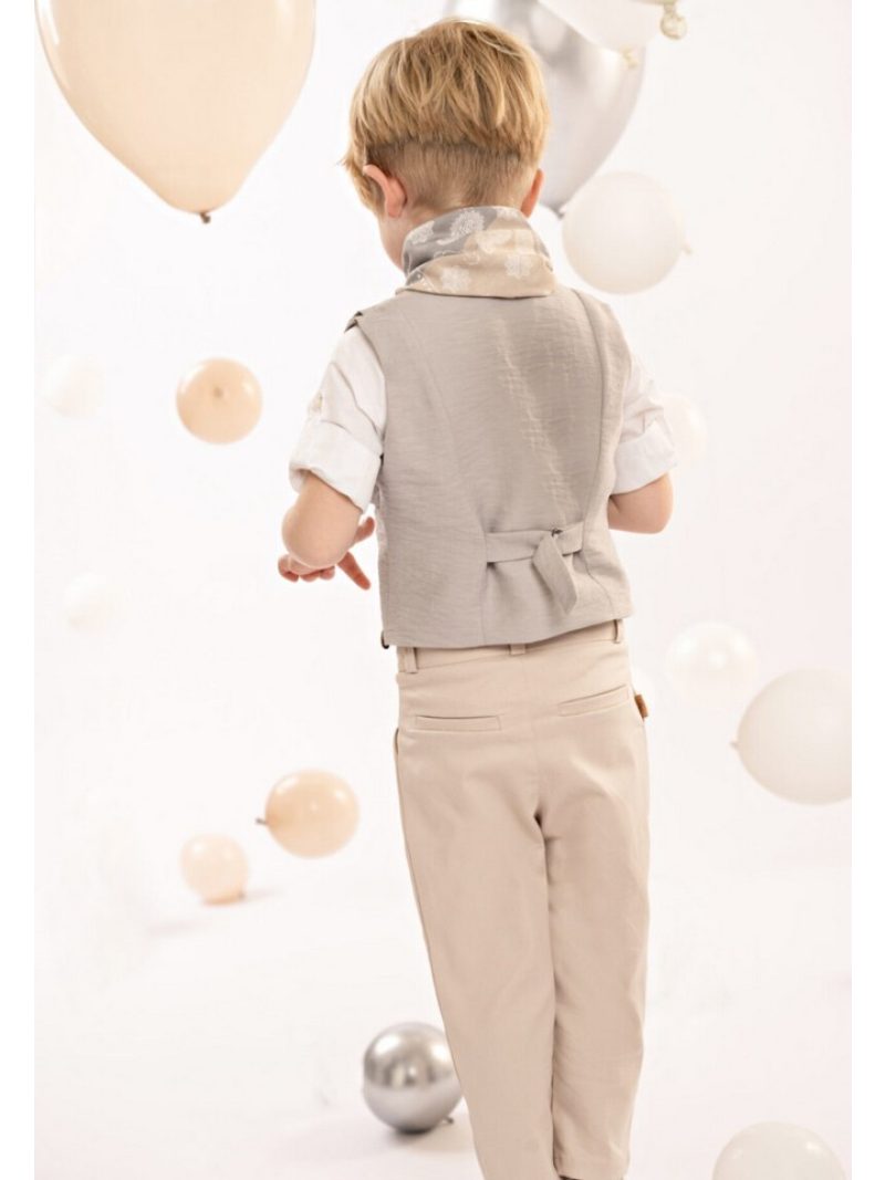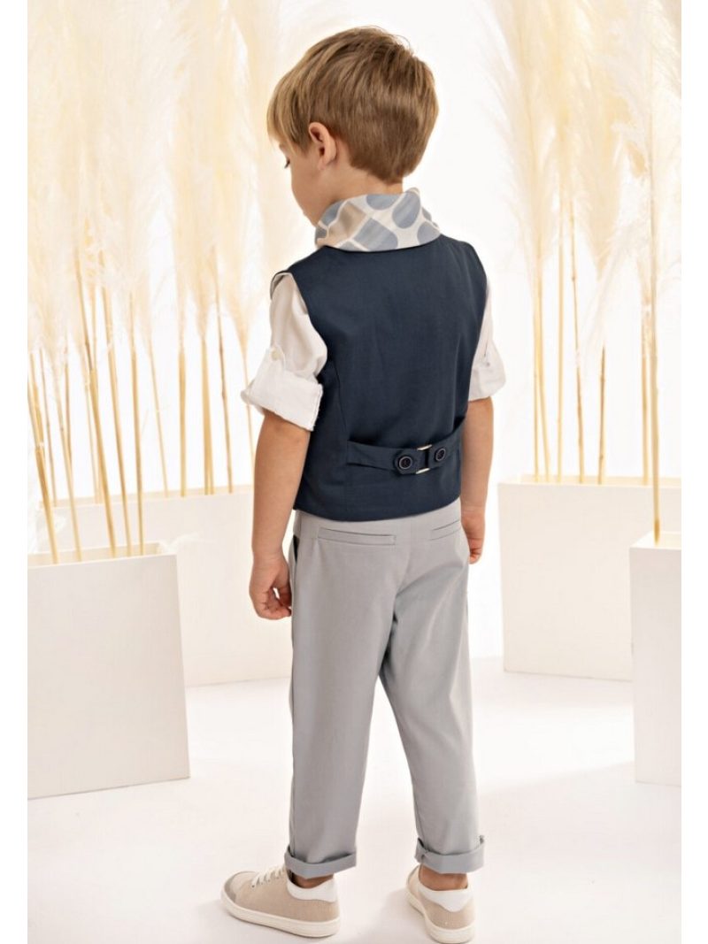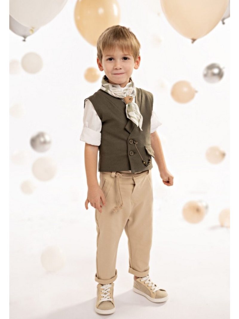 Ένα σύνολο με άψογη αισθητική, ιδανικό για μικρούς τζέντλεμεν! Σε αποχρώσεις του cobalt blue, το βαμβακερό καμβαδένιο παντελόνι διαθέτει ιδιαίτερη λεπτομέρεια στο ζωνάκι, ενώ το γιλέκο, με το λοξό κούμπωμα και τις τσέπες φιλέτο, προσδίδει σύγχρονη κομψότητα. Το βαμβακερό πουκάμισο σε off white απόχρωση ξεχωρίζει με τον ιδιαίτερο Mao γιακά του, προσφέροντας ένα σύγχρονο twist στο κλασικό ύφος. Το personalized βουάλ φουλάρι με γεωμετρικά μοτίβα σε σιέλ και μπεζ τόνους προσθέτει μια παιχνιδιάρικη πινελιά, ενώ η επιλογή ανάμεσα σε ψάθινο καπέλο ή κομψή τραγιάσκα ολοκληρώνει το look με στιλ και φινέτσα.