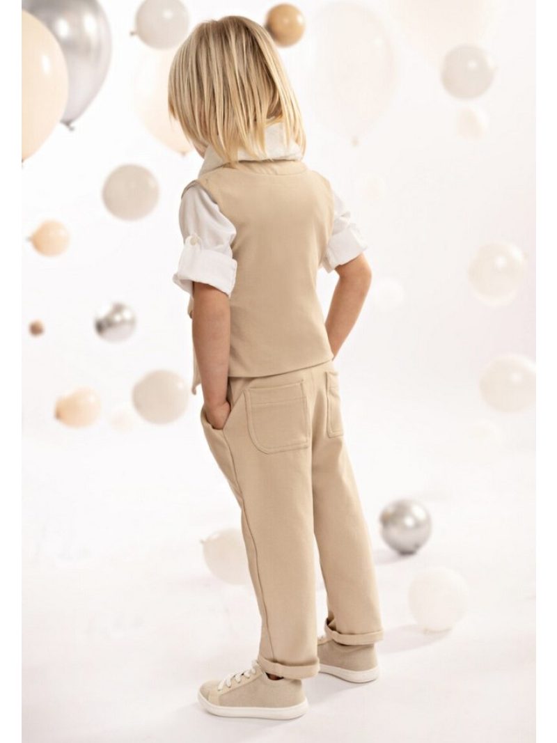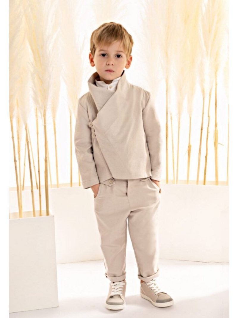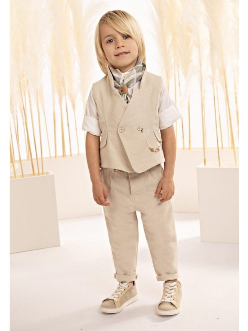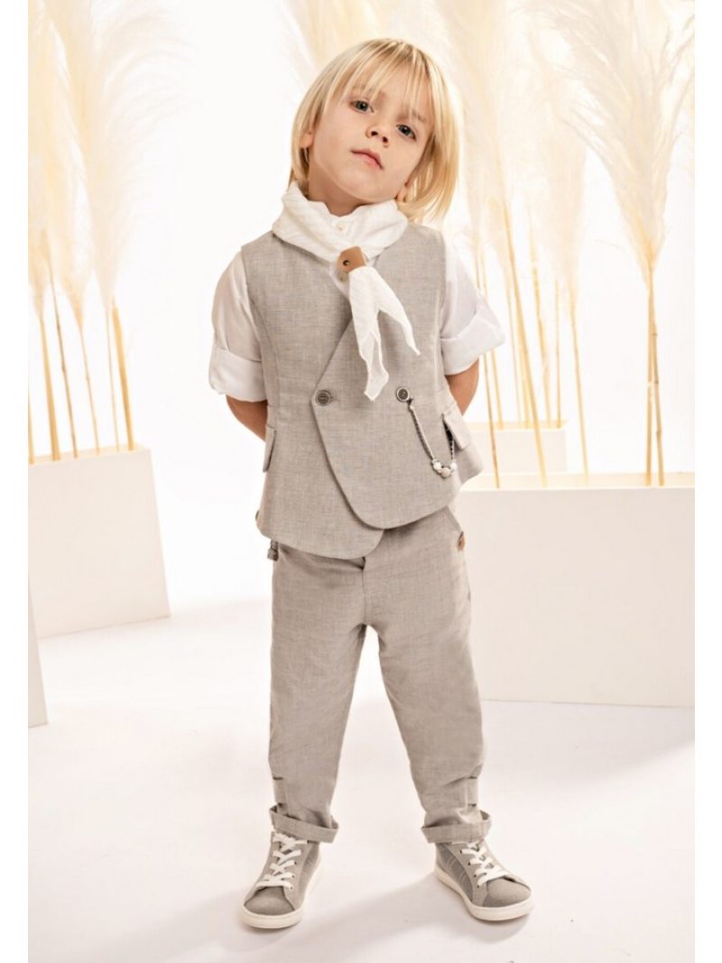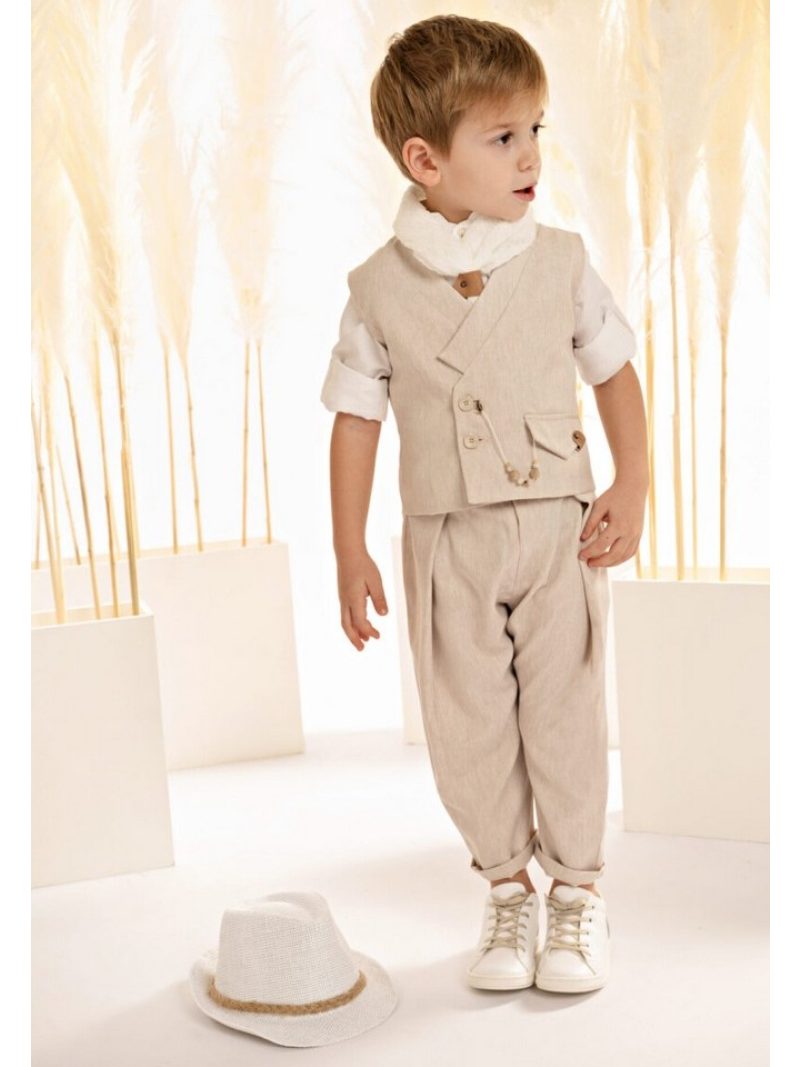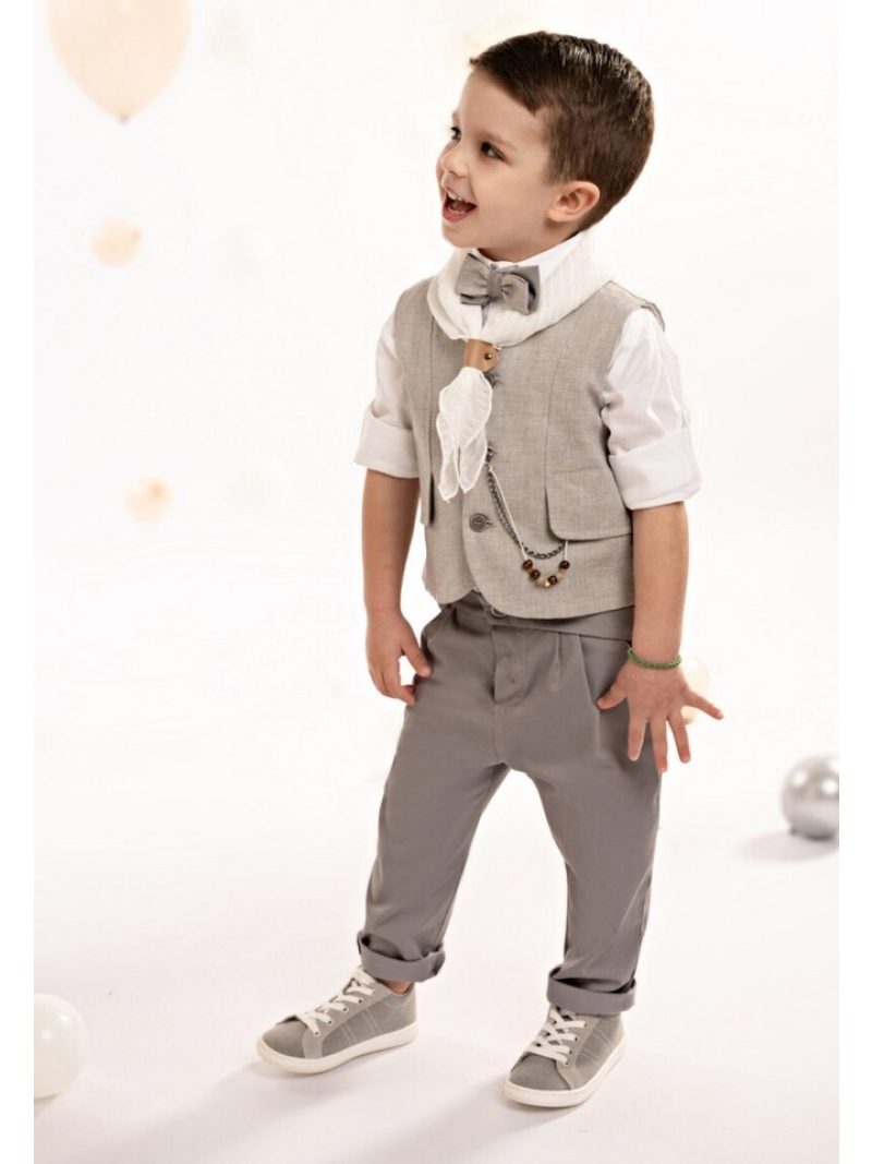 Ένα σύνολο με άψογη αισθητική, ιδανικό για μικρούς τζέντλεμεν! Σε αποχρώσεις του cobalt blue, το βαμβακερό καμβαδένιο παντελόνι διαθέτει ιδιαίτερη λεπτομέρεια στο ζωνάκι, ενώ το γιλέκο, με το λοξό κούμπωμα και τις τσέπες φιλέτο, προσδίδει σύγχρονη κομψότητα. Το βαμβακερό πουκάμισο σε off white απόχρωση ξεχωρίζει με τον ιδιαίτερο Mao γιακά του, προσφέροντας ένα σύγχρονο twist στο κλασικό ύφος. Το personalized βουάλ φουλάρι με γεωμετρικά μοτίβα σε σιέλ και μπεζ τόνους προσθέτει μια παιχνιδιάρικη πινελιά, ενώ η επιλογή ανάμεσα σε ψάθινο καπέλο ή κομψή τραγιάσκα ολοκληρώνει το look με στιλ και φινέτσα.