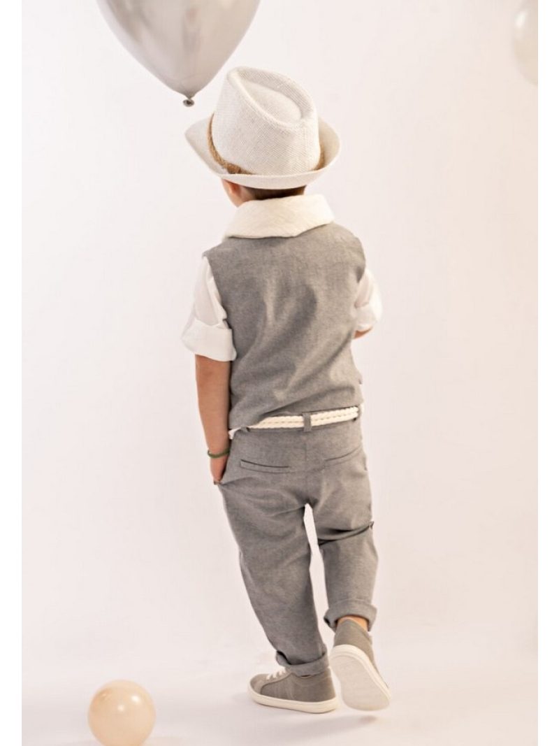 Μια εκλεπτυσμένη πρόταση που συνδυάζει διαχρονικό στυλ και ιδιαίτερο design. Το σύνολο περιλαμβάνει παντελόνι δίπιετο με έξτρα λοξή ζώνη, σε γκρι απόχρωση από βαμβακερή καμπαρντίνα, συνδυασμένο με γιλέκο σε κλασική γραμμή με έξυπνα κοψίματα, από μελανζέ γκρι cotton-lino ύφασμα. Το βαμβακερό πουκάμισο σε off white απόχρωση διαθέτει κλασικό γιακά και δένει άψογα με το ασορτί δίχρωμο παπιγιόν, το υπέροχο πλισέ φουλάρι σε off white χρώμα και το ψάθινο καπέλο ή τραγιάσκα (ανάλογα με την προτίμηση).