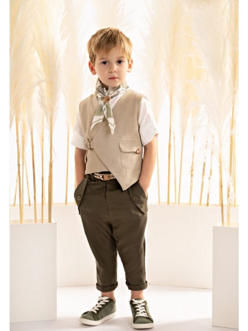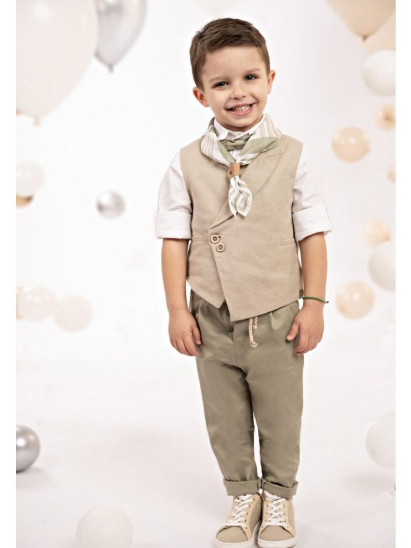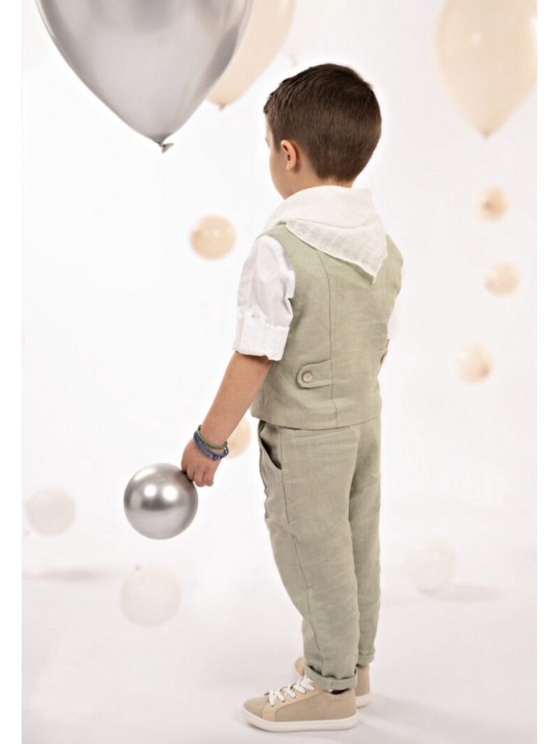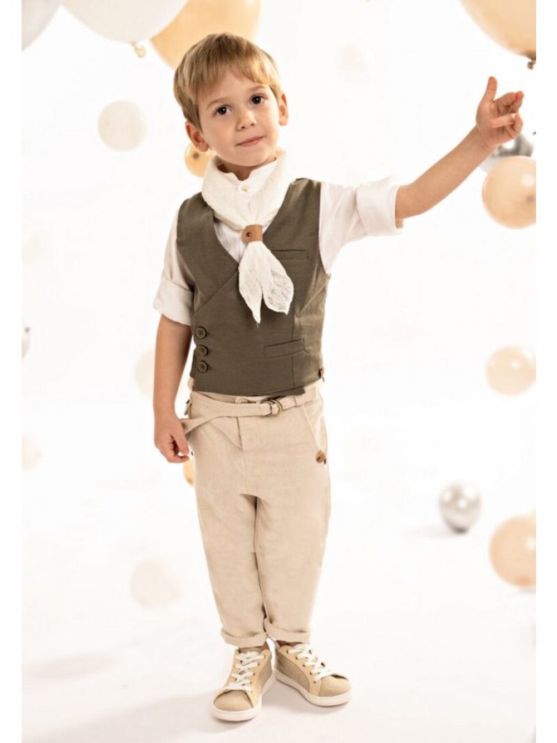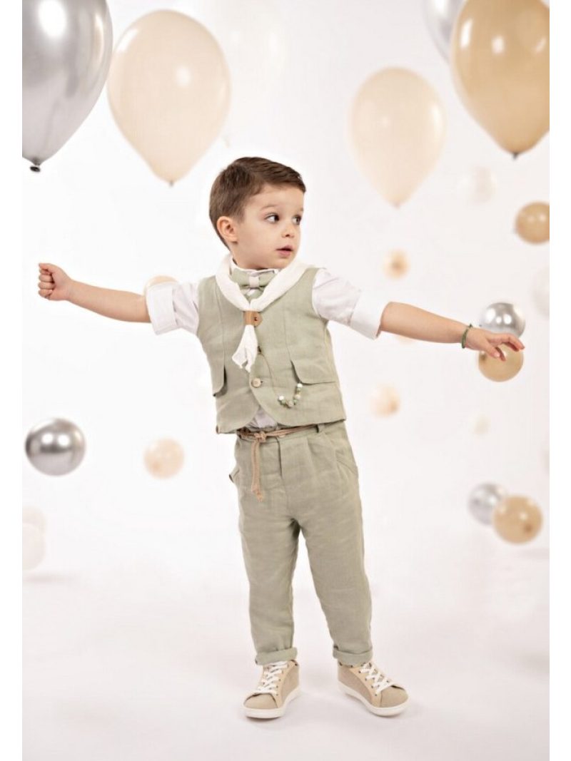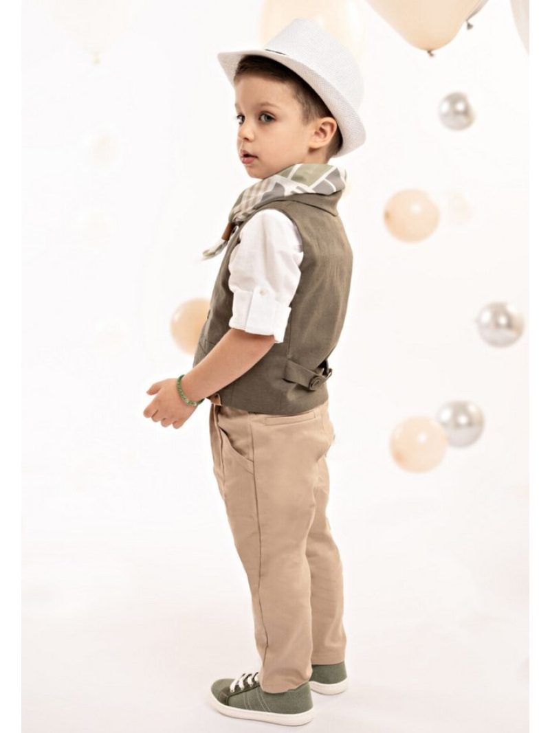 Ένα σύνολο που αποπνέει κομψότητα και φινέτσα. Το δίπιετο παντελόνι, με τσέπες φιλέτα, και το γιλέκο σε κλασική γραμμή, με έξυπνα κοψίματα, είναι φτιαγμένα από υπέροχο 100% λινό ύφασμα σε χρώμα ευκαλύπτου. Το βαμβακερό πουκάμισο σε off white απόχρωση με κλασικό γιακά, ολοκληρώνει την απλότητα και την κομψότητα του συνόλου. Το σετ αναδεικνύεται με το ασορτί δίχρωμο παπιγιόν, το φουλάρι σε off white από βαμβακερή υφαντή γάζα, τη ζώνη από μπεζ κορδόνι και το ψάθινο καπέλο ή τραγιάσκα (ανάλογα με την προτίμηση), προσφέροντας μια αψεγάδιαστη εμφάνιση.